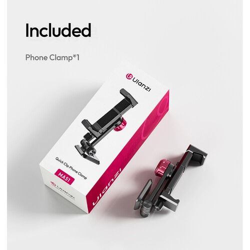 Az Ulanzi MA51 QuickClip telefoncsipesz egy sokoldalú telefon tartó, UKA gyorskioldó talppal, 180°-os dönthetőséggel, 360°-os forgathatósággal és kettős hideg cipőtalppal a kiegészítők számára, 2,6–3,5 hüvelyk széles okostelefonokkal kompatibilis.