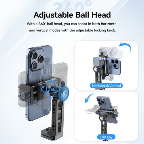 Az Ulanzi MA53 gömbfejű telefon tartó professzionális szintű rugalmasságot és stabilitást biztosít okostelefon-alkotók számára. Tartós alumíniumból készült, szilikonbélésű pofákkal biztonságosan rögzíti a 2,4 és 3,7 hüvelyk széles okostelefonokat, megvédve készülékét a karcolásoktól és a nem kívánt mozgásoktól.