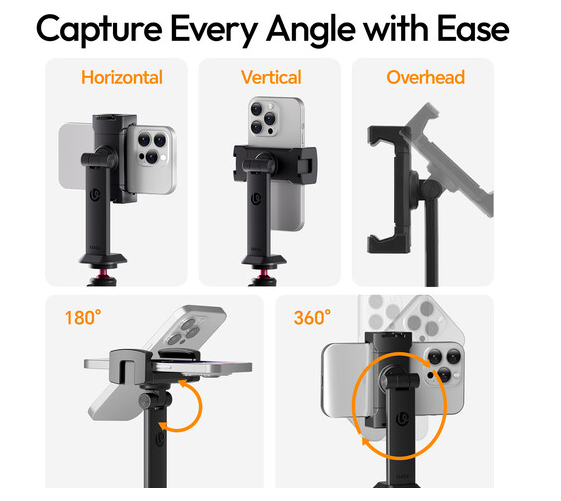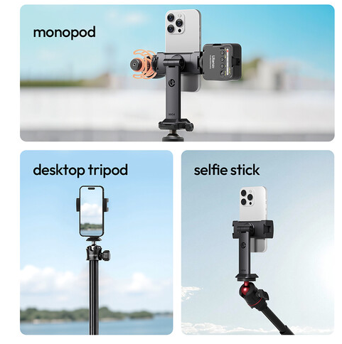 Az Ulanzi MA54 Uka telefon tartó egy sokoldalú okostelefon-rögzítő, amelyet alkotók számára terveztek, Uka gyorskioldó talppal, 360°-os forgathatósággal, 180°-os dönthetőséggel és kettős hideg cipőtalppal a kiegészítők számára. Biztonságosan rögzíti a 2,4–4,1 hüvelyk széles okostelefonokat, és rugalmas rögzítési lehetőségeket kínál állványokhoz, monopodokhoz és szerelvényekhez.