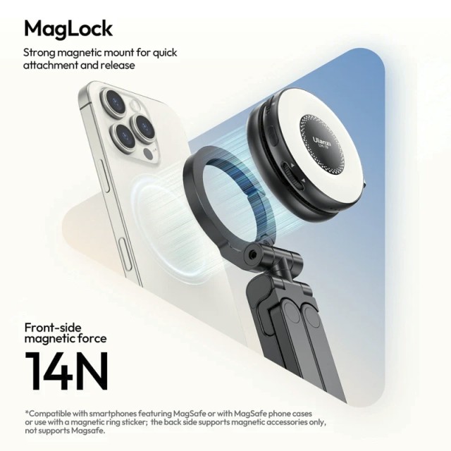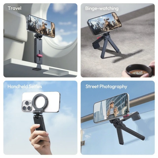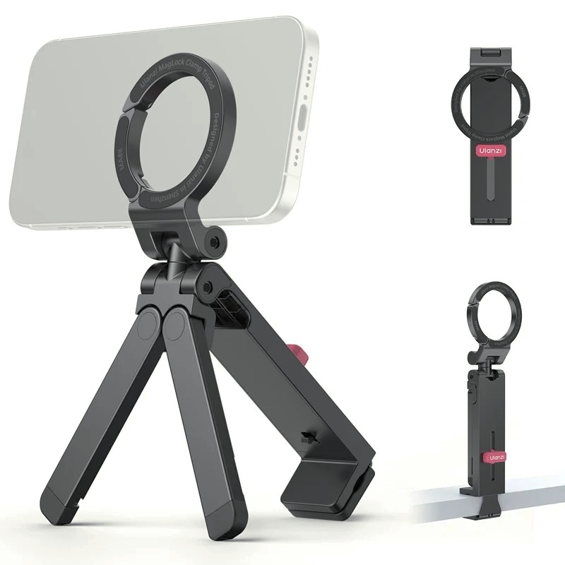 Az Ulanzi MA88 MagLock telefon tartó állvány egy sokoldalú mágneses telefon tartó és mini állvány, amely ötvözi a MagSafe kompatibilitást, a 360°-os forgást és a többszögű felvételi módokat. Asztali állványként, kézi szelfibotként vagy felületekre rögzíthető kreatív „Mantis Mode” felvételek készítéséhez is használható.
