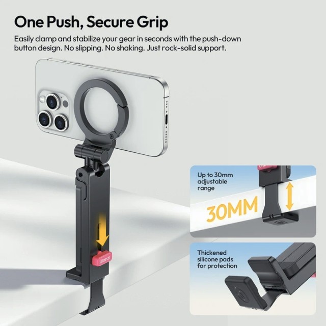 Az Ulanzi MA88 MagLock telefon tartó állvány egy hordozható és multifunkcionális telefon tartó, amelyet mobil alkotók, streamerek és vloggerek számára terveztek. Szabadalmaztatott, kétoldalas MagLock kialakításának köszönhetően azonnal mágnesesen rögzíthető a MagSafe-kompatibilis telefonokhoz vagy tokokhoz. Az erős mágneses erő biztosítja a csúszás és rázkódás nélküli biztonságos rögzítést.