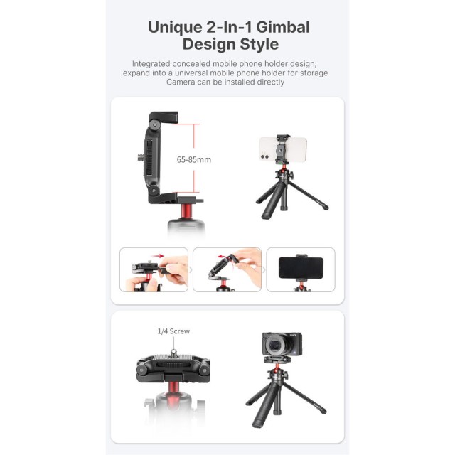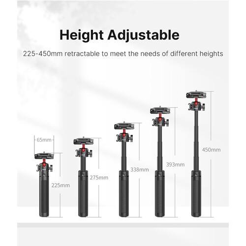 Az Ulanzi MT-41 4-szakaszos teleszkópos mini állvány V2 azoknak a kreatívoknak készült, akiknek kompakt formában sokoldalúságra van szükségük. Ez az asztali állvány teleszkópos középső oszloppal rendelkezik, amely 45 cm-ig nyújtható, így stabil mini állványként és kényelmes kézi szelfibotként is használható. Beépített gömbfeje sima kézi beállítást biztosít, akár 90°-os függőleges dőlésszöggel, így könnyen válthatunk vízszintes és függőleges felvételek között.