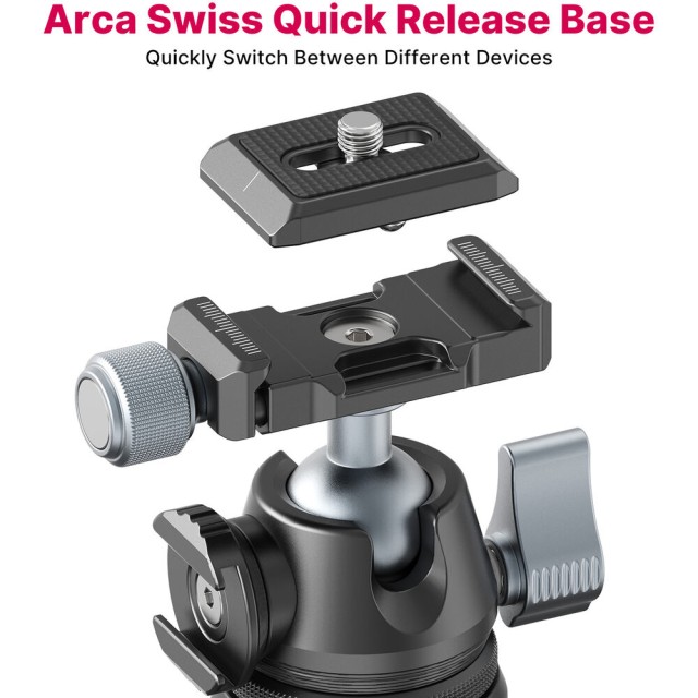 Az integrált gömbfej 360°-os panorámás forgatást és 90°-os függőleges dőlést tesz lehetővé, így gyorsan válthatunk tájkép és portré orientáció között. Az egyetlen reteszelőkar segítségével a beállítások gyorsan és intuitív módon elvégezhetők. A kiemelkedő jellemzője a vékony Arca-típusú gyorskioldó lemez, amely szerszámok nélkül lehetővé teszi a kamera gyors felszerelését és eltávolítását. Ezenkívül a forgatható hideg cipőfoglalat segítségével kiegészítőket, például mikrofonokat, LED-es lámpákat vagy monitorokat is felszerelhetünk, így kompakt, professzionális felvételi berendezést hozhatunk létre.