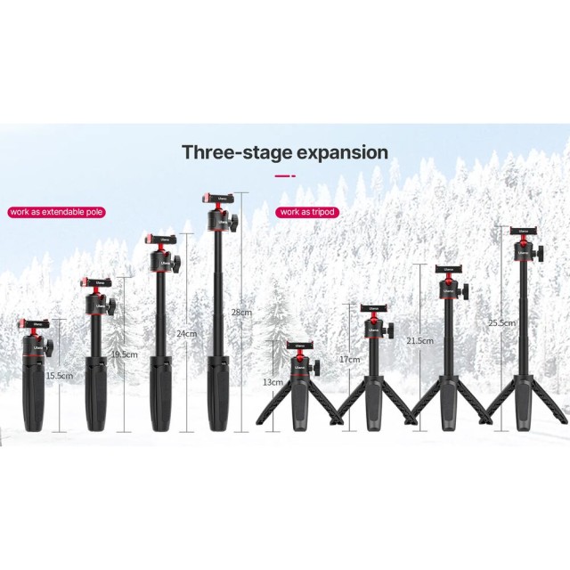 Ez a könnyű állvány állvány módban 13 cm-ről 25,5 cm-re nyújtható, és kézi szelfibotként használva elérheti a 28 cm-t is. Alumíniumból, ABS műanyagból és szilikonból készült, csúszásmentes fogási felületekkel rendelkezik, por- és vízálló, így extrém körülmények között is megbízható. A háromlábú állvány kompakt, összecsukott hossza 15,5 cm, így könnyen hordozható hátizsákban vagy zsebben, ami tökéletessé teszi szabadtéri, kaland- és utazási felvételek készítéséhez.
