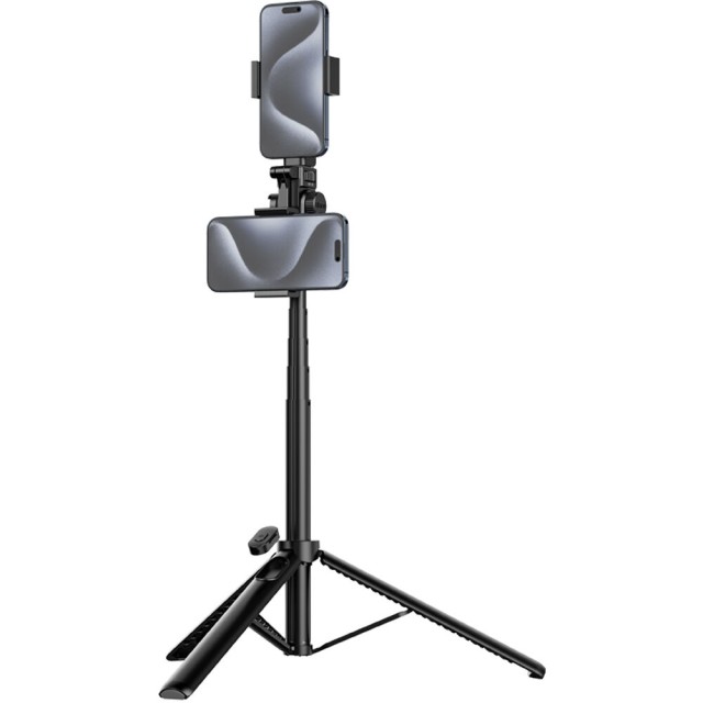 Az Ulanzi MT-70 360° forgatható kettős kamerás állvány egy multifunkcionális kiegészítő okostelefonokhoz és kis kamerákhoz, amelyet tartalomkészítők, vloggerek és élő streamerek számára terveztek. 7 részes alumíniumötvözetből készült rúdja 32 cm-től 158 cm-ig nyújtható, így szelfibotként, kézfogóként vagy önálló állványként is használható.