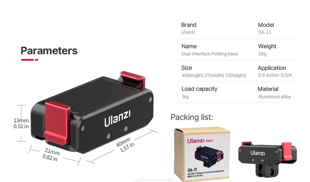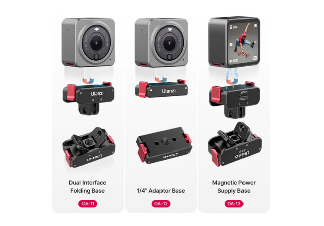 A DJI Action 2-hez kifejezetten tervezett Ulanzi 2843A kettős interfészű összecsukható alapzat kompakt, összecsukható kialakításával bővíti a kamera rögzítési lehetőségeit. Az adapter mágneses talppal és két kapcsával biztonságosan rögzíthető a kamerához, miközben kétféle rögzítési felületet biztosít: egy 2-pólusú rögzítést, amely kompatibilis a GoPro-típusú rögzítésekkel, és egy összecsukható 1/4"-20 menetes talpat, amely ideális állványokhoz, csuklós karokhoz vagy más tartókhoz.