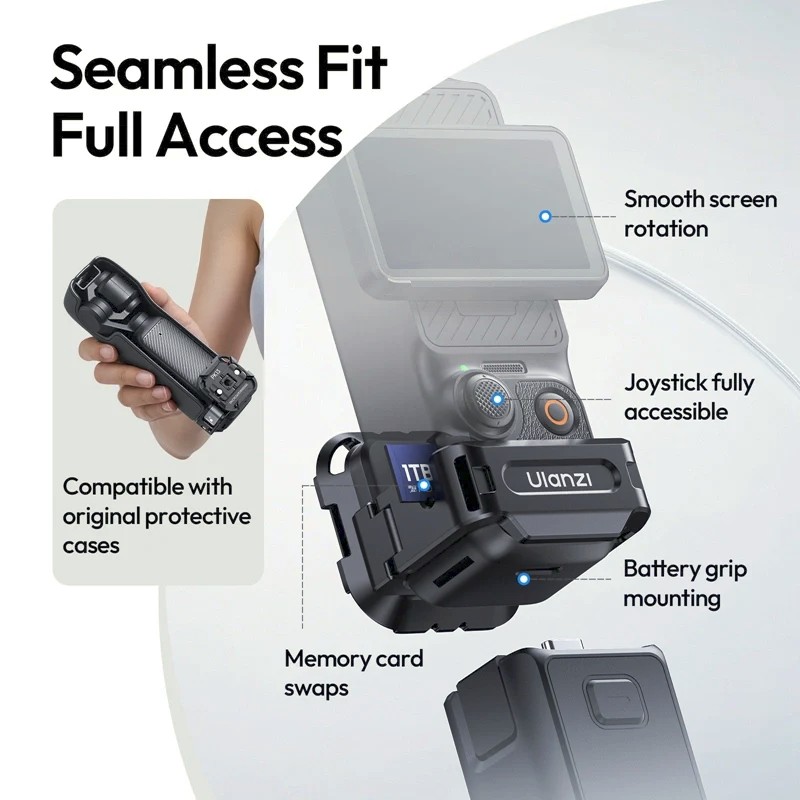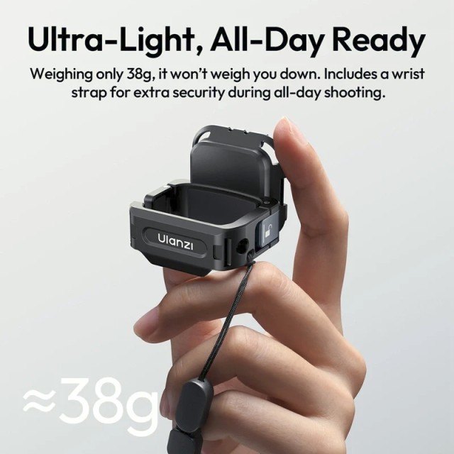 Az adapter univerzális 1/4 hüvelykes menettel és GoPro tartókompatibilitással rendelkezik, így rugalmasan csatlakoztathatja Pocket 3 készülékét állványokhoz, mini állványokhoz, válltartókhoz vagy hátizsákokhoz a kézmentes felvételekhez. A CNC alumíniumötvözetből készült robusztus felépítése ellenére a PK13 súlya mindössze 38 g, így rendkívül könnyű és utazáshoz is alkalmas. A kialakítás teljes hozzáférést biztosít a képernyőhöz, a joystickhoz, a memóriakártyához és az akkumulátorfogantyúhoz, miközben támogatja az eredeti védőtokokat is. A csuklópánt extra biztonságot nyújt aktív felvételek készítése közben, a mellékelt csavarkulcs és csavarok pedig gyors összeszerelést biztosítanak.
