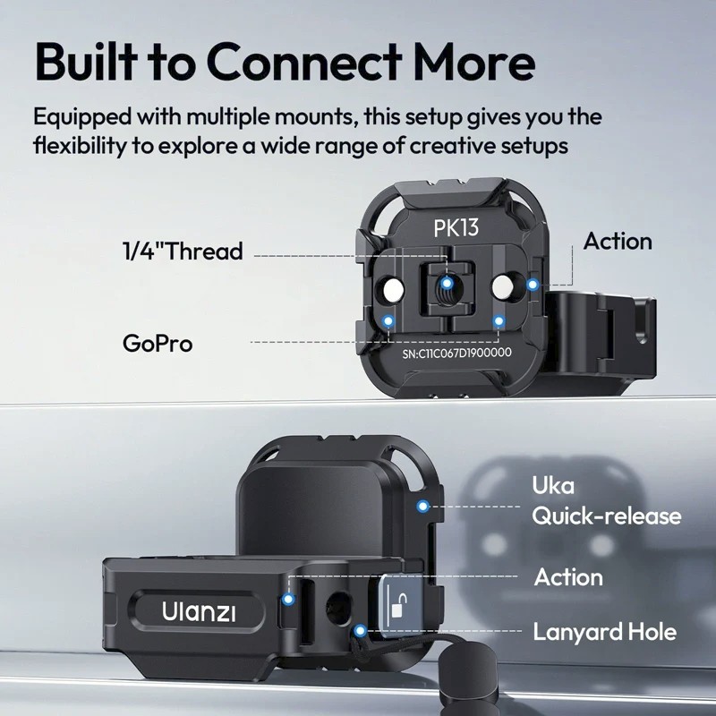 Fokozza DJI Pocket 3 élményét az Ulanzi PK13 Uka bővítő adapterrel, amelyet gyors és biztonságos rögzítésre terveztek számos kameratartóhoz, állványhoz és akciótartóhoz. Az Uka gyorskioldó rendszerének köszönhetően könnyedén felszerelhető és leszerelhető, míg a kettős reteszelő rendszer (pattintós retesz + pozicionáló csavar) biztosítja a stabilitást gyors tempójú akciófelvételek vagy POV-felvételek készítése közben.