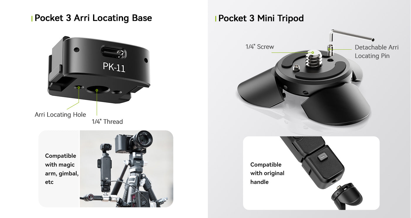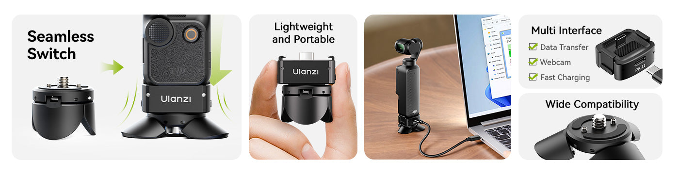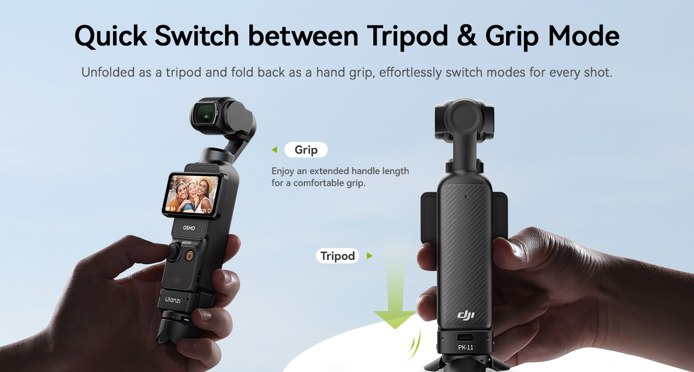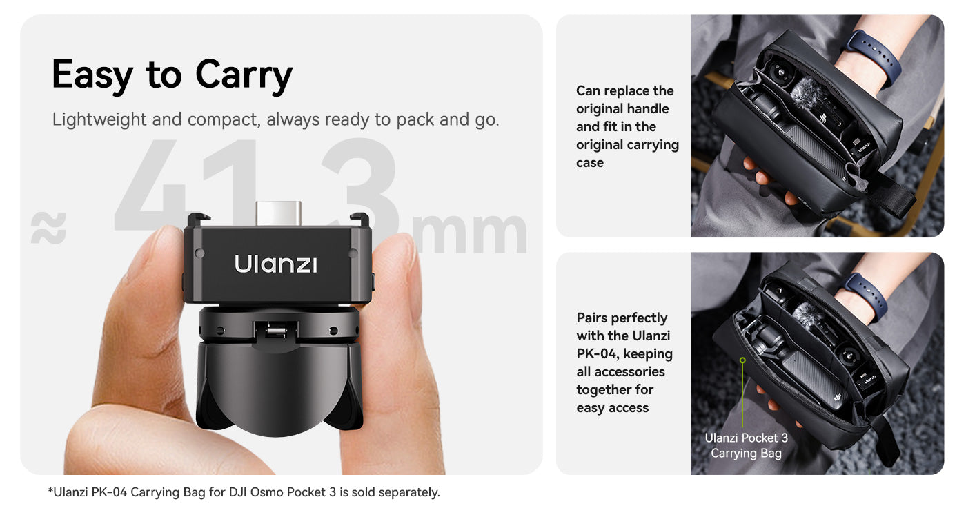 Az Ulanzi Pocket3 Mini állvány tökéletes kompakt kiegészítő azoknak a DJI Osmo Pocket 3 felhasználóknak, akik stabilitást és rugalmasságot keresnek útközben. Könnyű kialakításának és többféle üzemmódjának köszönhetően könnyen átállítható állvány és kézi markolat üzemmód között. Az integrált 1/4 hüvelykes csavar és a levehető Arri rögzítőcsap széles körű kompatibilitást biztosít a kiegészítőkkel, míg a teljes funkcionalitású Type-C adatport használat közbeni töltést tesz lehetővé. Ideális utazáshoz, vlogoláshoz és asztali felvételekhez, ez a mini állvány professzionális szintű teljesítményt nyújt zseb méretű csomagban