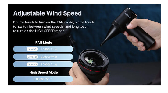 Négy állítható sebességbeállítással ellátott légporeltávolítóval a különböző tisztítási feladatok – a kényes fényképezőgép-felszereléstől a billentyűzetekig, a PC-alkatrészekig és az asztali berendezésekig – precíz vezérlése lehetséges. Az erőteljes motor 40 000 és 100 000 fordulat/perc közötti fordulatszámot biztosít, garantálva a hatékony tisztítási teljesítményt.