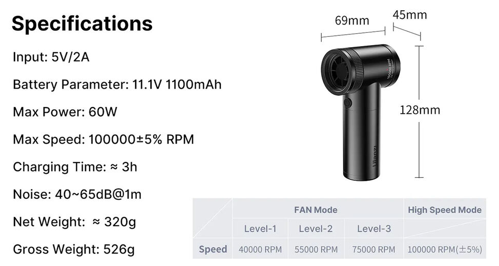 A beépített 1100 mAh-s újratölthető akkumulátor akár 120 perc üzemidőt biztosít, és USB-C-n keresztül gyorsan feltölthető, körülbelül egy óra alatt elérve a teljes teljesítményt. A LED-es akkumulátor-jelzőfény tájékoztatja a fennmaradó töltöttségről, míg a mellékelt fúvókák növelik a tisztítás rugalmasságát különböző alkalmazásokhoz.