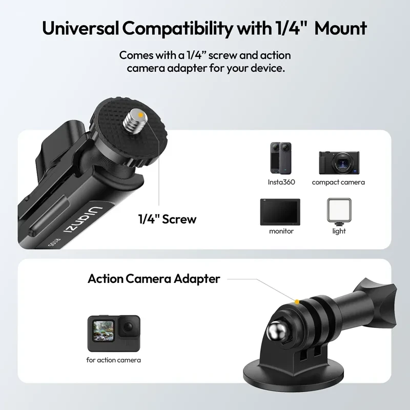 Az Ulanzi R105 kerékpár sínre rögzíthető bilincs C057 egy strapabíró, teljesen fémből készült kameratartó, amelyet kerékpárosok és szabadtéri alkotók számára terveztek. Hármas karomfogással és csúszásgátló gumi párnákkal rendelkezik, így páratlan stabilitást biztosít a kormányon, síneken vagy sík felületeken. A kesztyűvel is könnyen kezelhető gomb 12–55 mm-ig állítható, míg a 360°-ban forgatható kettős gömbfej teljes forgást és döntést biztosít a dinamikus felvételi szögekhez. Kompatibilis 1/4 hüvelykes csavaros eszközökkel és GoPro-típusú akciókamerákkal, és akár 1 kg-os terheléstis elbír, így tökéleteskompakt kamerák, lámpák vagy monitorok rögzítéséhez.