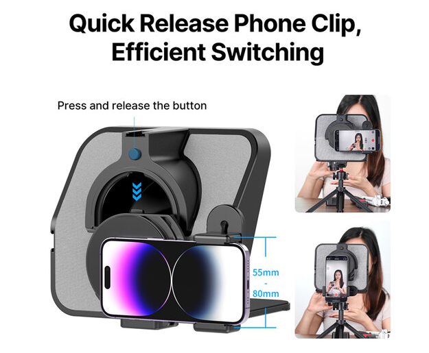 Az RT02 2,1–3,1 hüvelyk széles okostelefonokat és legfeljebb 6 hüvelykes táblagépeket támogat, és az öt mellékelt adaptergyűrű egyikével közvetlenül DSLR- vagy tükör nélküli fényképezőgépek objektívjére szerelhető. A mellékelt gyorskioldó telefonklip segítségével okostelefonokkal is használható, így kamerás és mobil felvételi beállításokhoz egyaránt alkalmas.