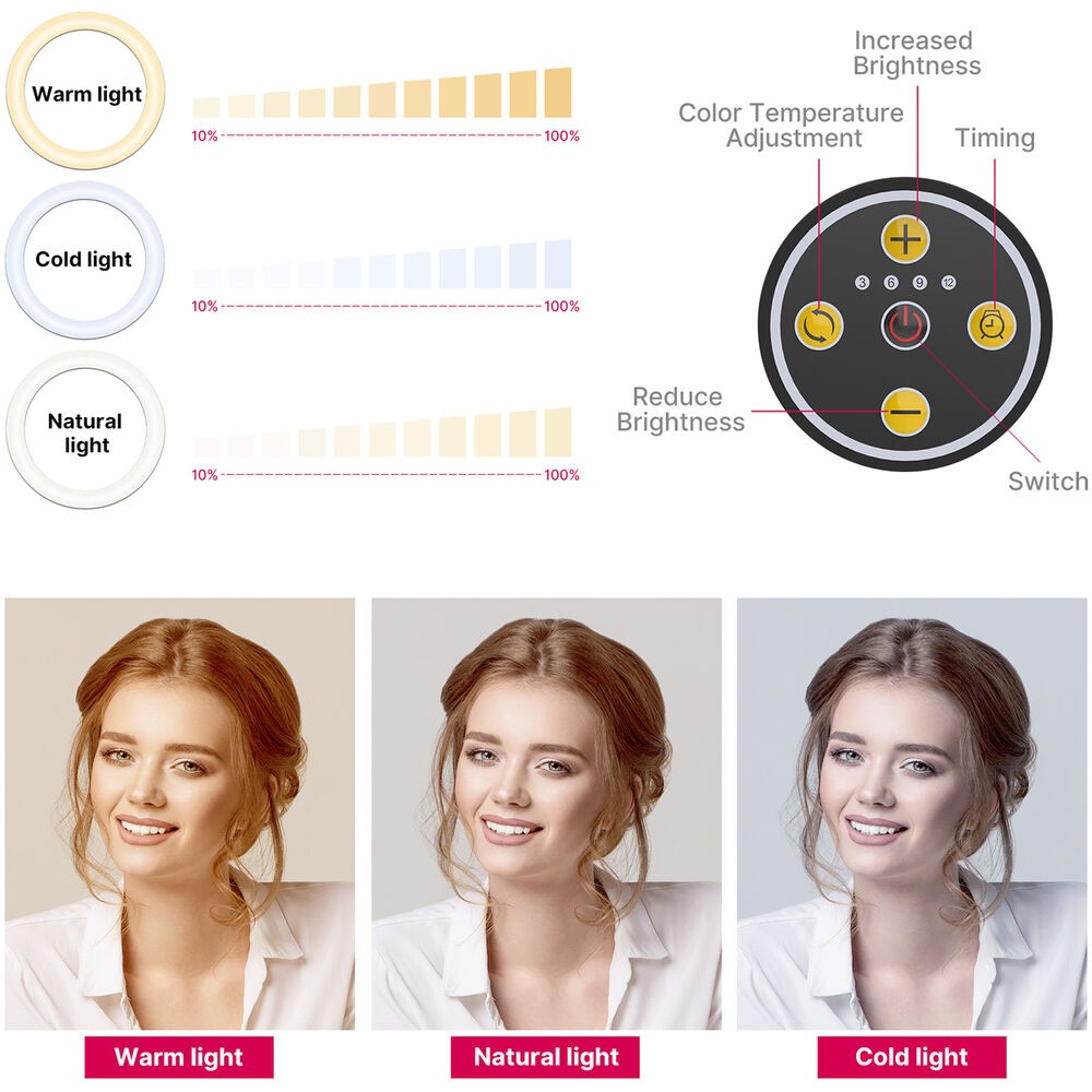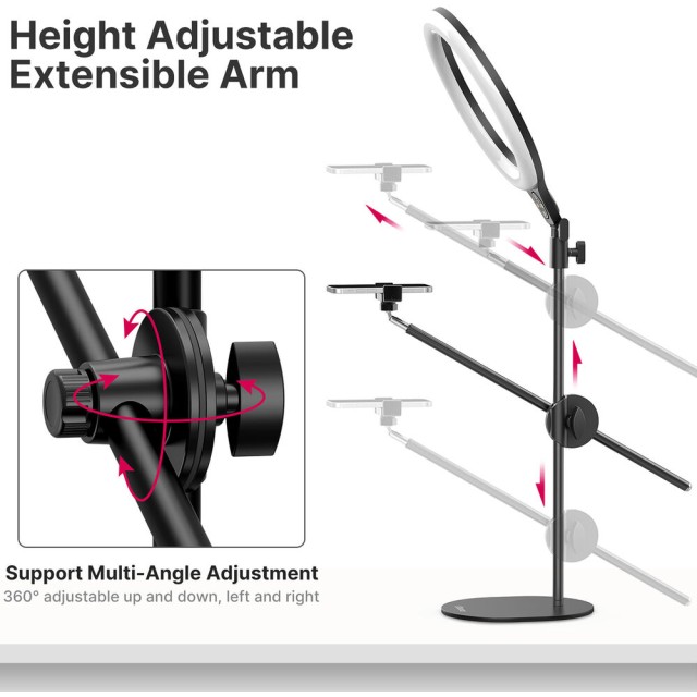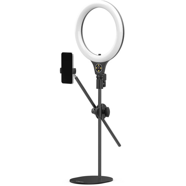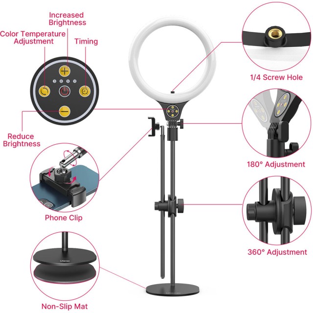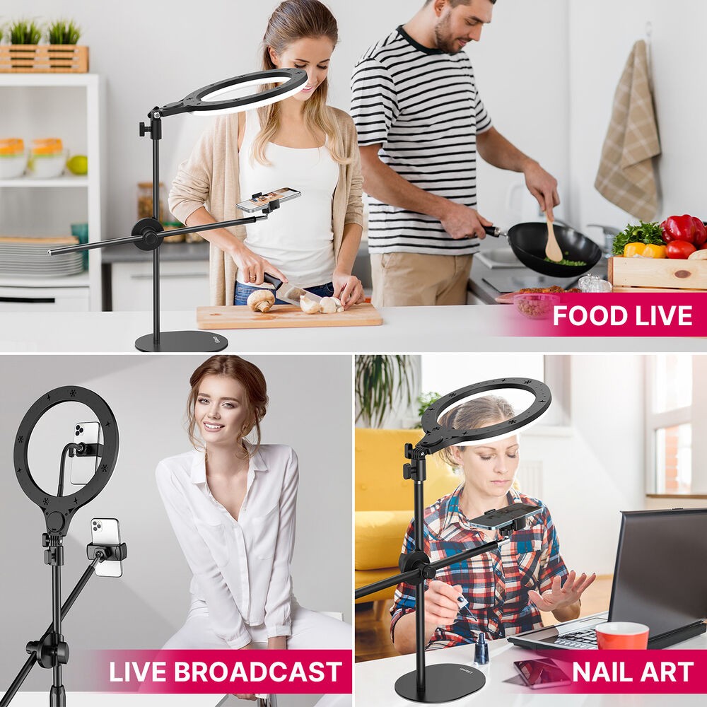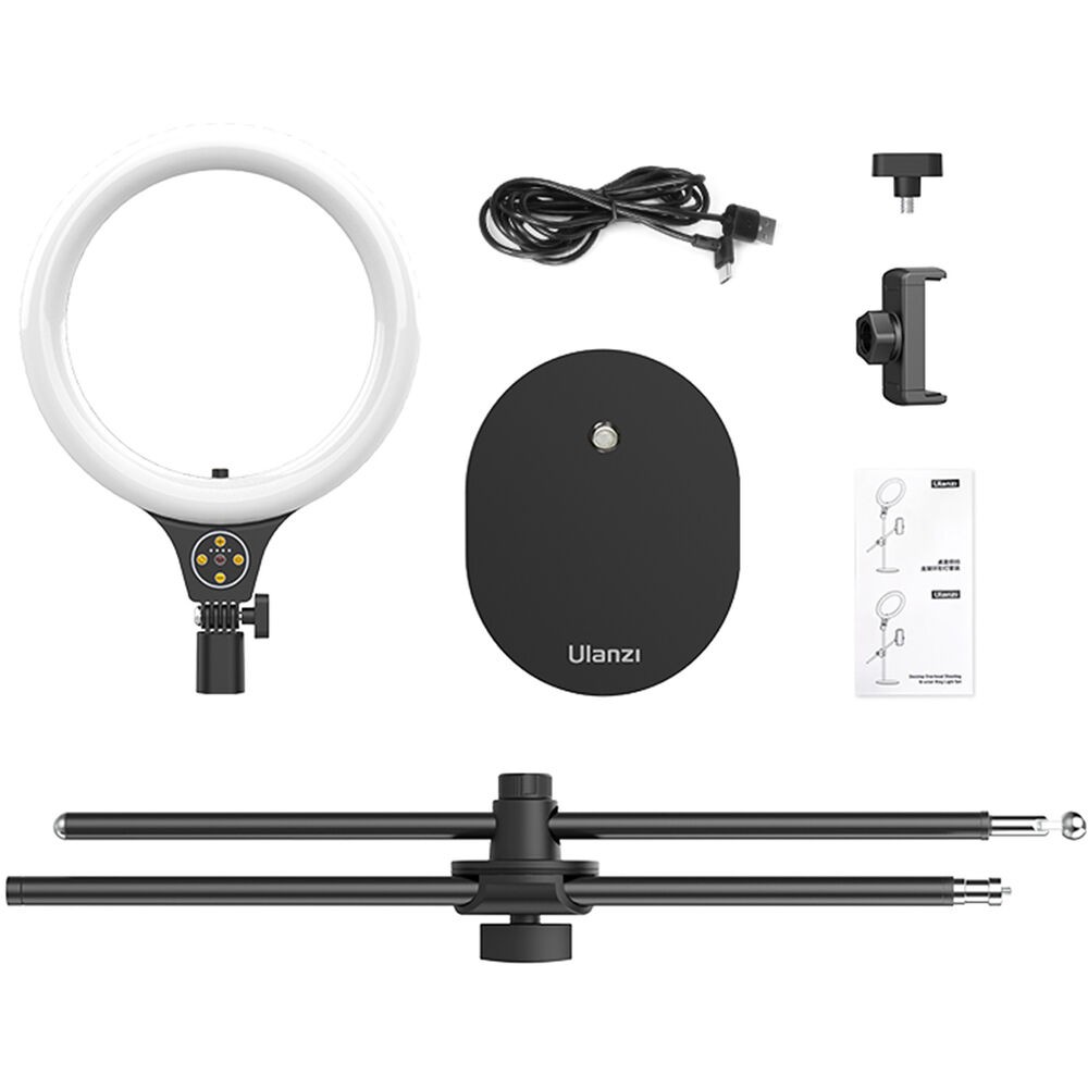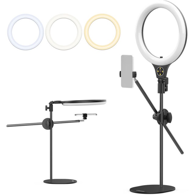 Az Ulanzi T1 Overhead Ring Light Set egy 10 hüvelykes LED gyűrűs lámpa, amelynek magassága 32 hüvelykig állítható, és felső megvilágításra alkalmas . 3500–6500 K színhőmérséklettel, 11 fényerőszinttel és beépített telefontartóval rendelkezik, így ideális étel-, szépség- és divatvlogokhoz vagy asztali tartalomkészítéshez.