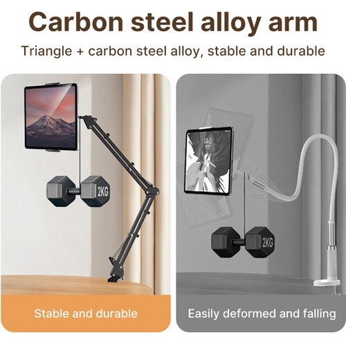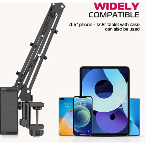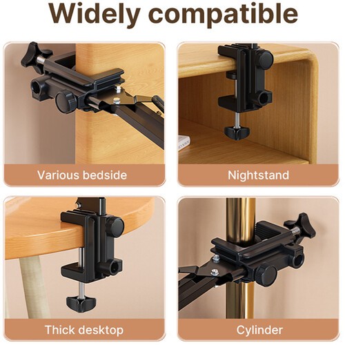 A szokásos irodai asztali lámpákhoz nagyon hasonlóan, az Ulanzi telefonokhoz és táblagépekhez készült kettős karos asztali tartója ergonómikusabb, kényelmesebb és sokoldalúbb nézői élményt nyújt élő közvetítések, ágyban való közösségi média böngészés vagy szeretteivel való videocsevegés közben. A bilincs biztonságosan rögzíthető bármilyen asztalhoz, ágyfejhez vagy oszlophoz, amelynek vastagsága vagy kerülete legfeljebb 4 cm. A rugós bilincs 11,5 cm és 33 cm szélességű eszközöket képes megtartani, így ideális telefonokhoz és nagy táblagépekhez egyaránt. A beállítás után a forgó talp, a három forgáspont és a 10 cm hosszú, 360°-ban forgatható tartó segítségével rendkívül széles beállítási és kiterjesztési tartományt élvezhet. A 33 cm-es kettős rugós mechanizmusnak köszönhetően a beállítás egy kézzel elvégezhető, és stabil marad.