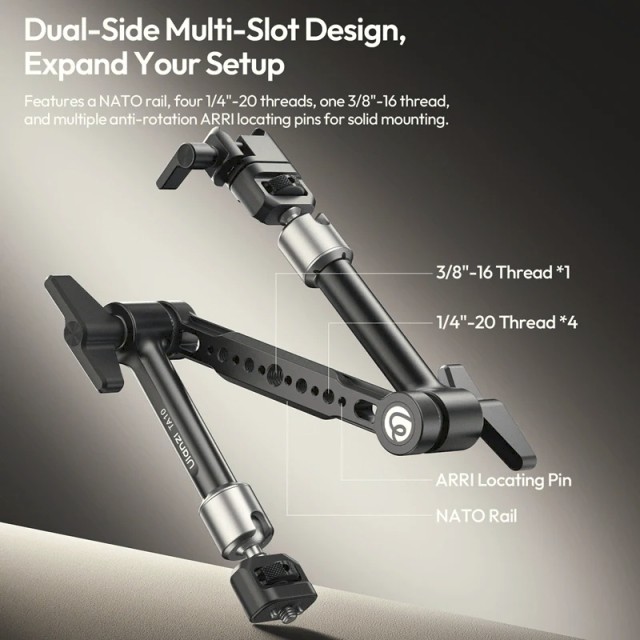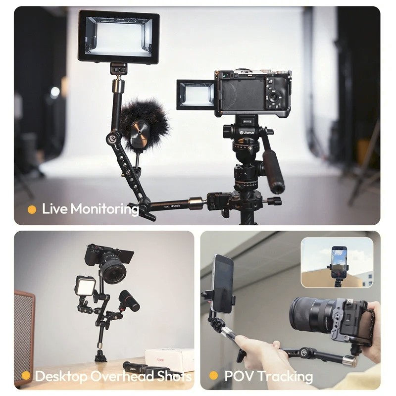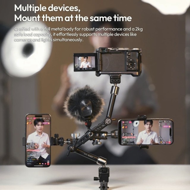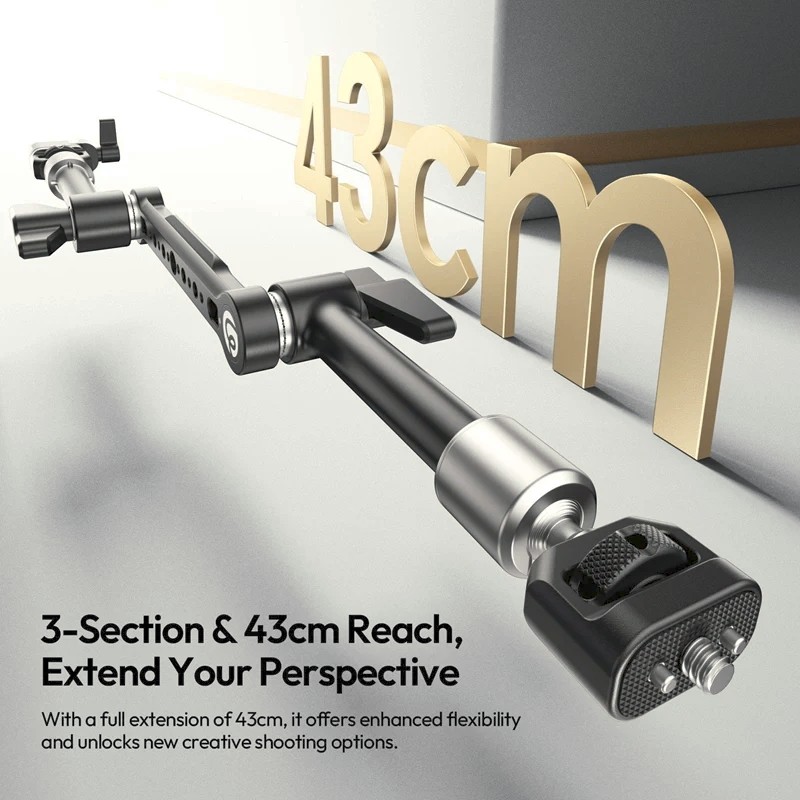 Az Ulanzi TA10 3-részes mágikus csuklós kar azoknak a kreatívoknak készült, akik maximális rugalmasságot és megbízható erőt igényelnek egy kompakt megoldásban. Háromrészes csuklós kialakításával és 43 cm-es teljes kinyújtott hosszával ez a kar több kreatív felvételi szöget kínál élő monitorozáshoz, asztali felülnézeti felvételekhez, POV követéshez és komplex szerkezetekhez.