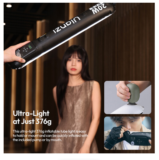 Az Ulanzi UA20C egy rugalmas, felfújható RGB csővilágítás, amelyet fotósok, videósok és tartalomkészítők számára terveztek. Könnyű, hordozható és mágneses, ez a 60 cm-es cső 1800K-tól 10 000K-ig teljes spektrumú világítást biztosít, a színárnyalat, a telítettség és az intenzitás pontos szabályozásával.