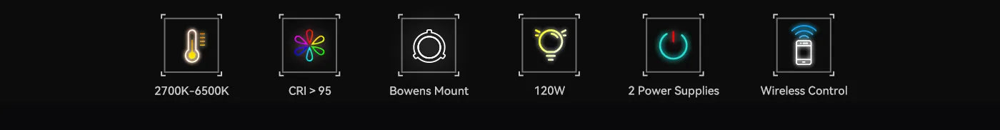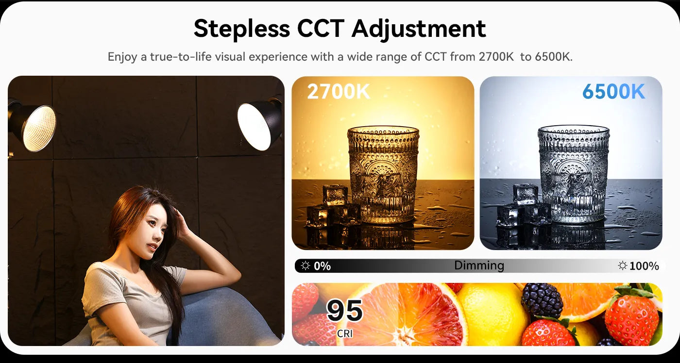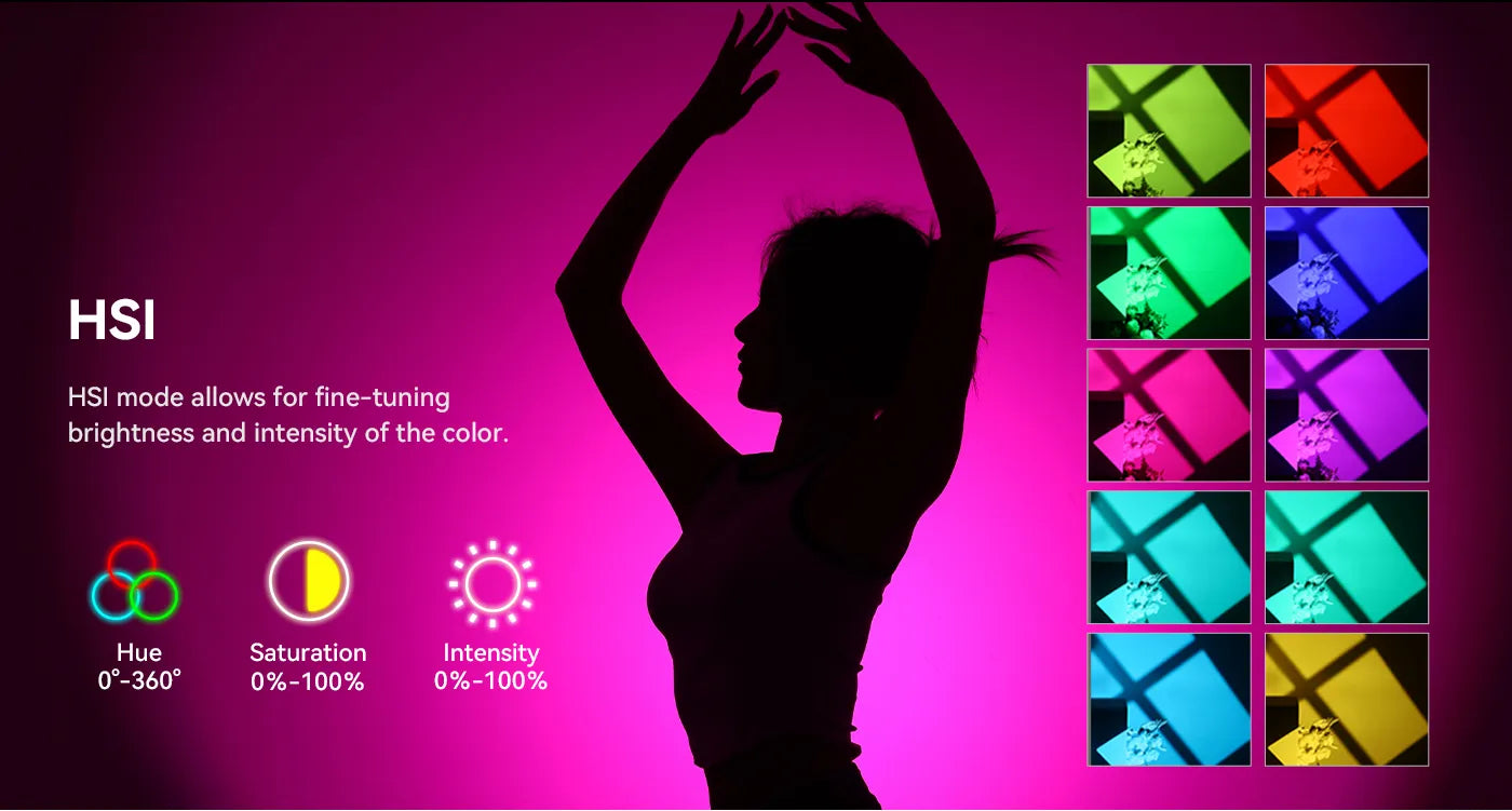 Kettős tápellátási lehetőségekkel rendelkezik: kültéren a V-mount akkumulátort használhatja a mobilitás érdekében, beltéren pedig a DC tápegységet a stabil áramellátás érdekében. A színhőmérsékletet fokozatmentesen állíthatja 2700K és 6500K között (CRI>95), a fényerőt pedig 0% és 100% között. HSI módban finomhangolhatja a színárnyalatot, a telítettséget és az intenzitást a teljes 360°-os színspektrumon.