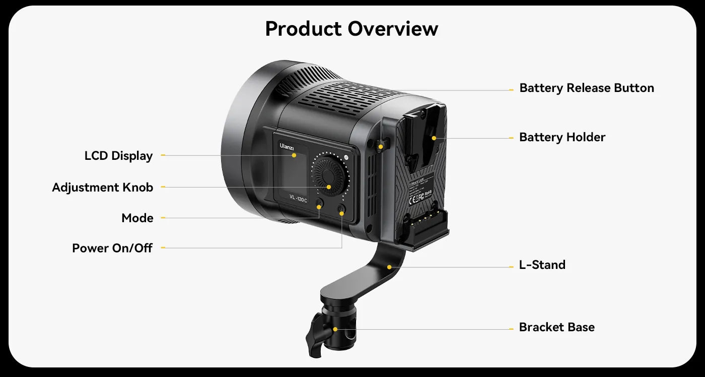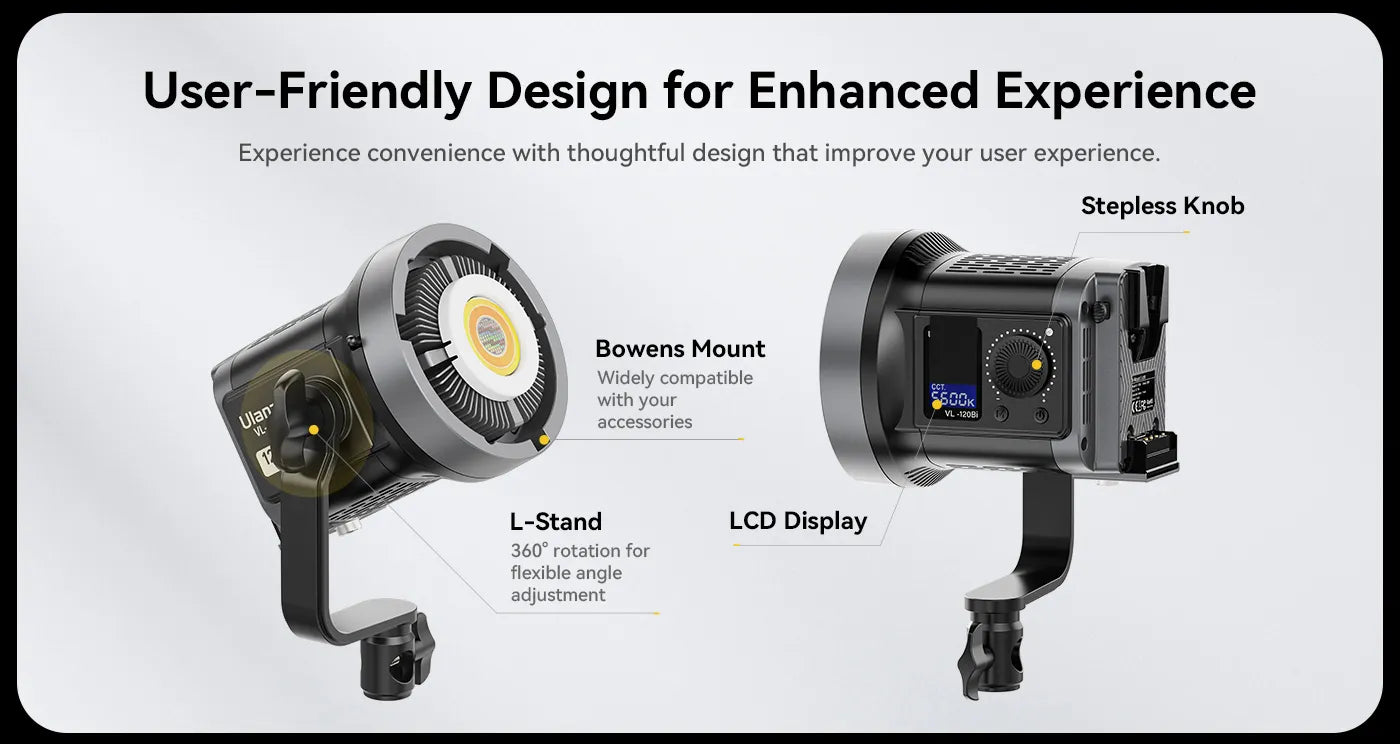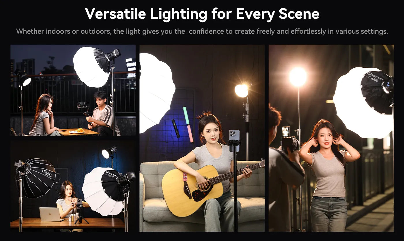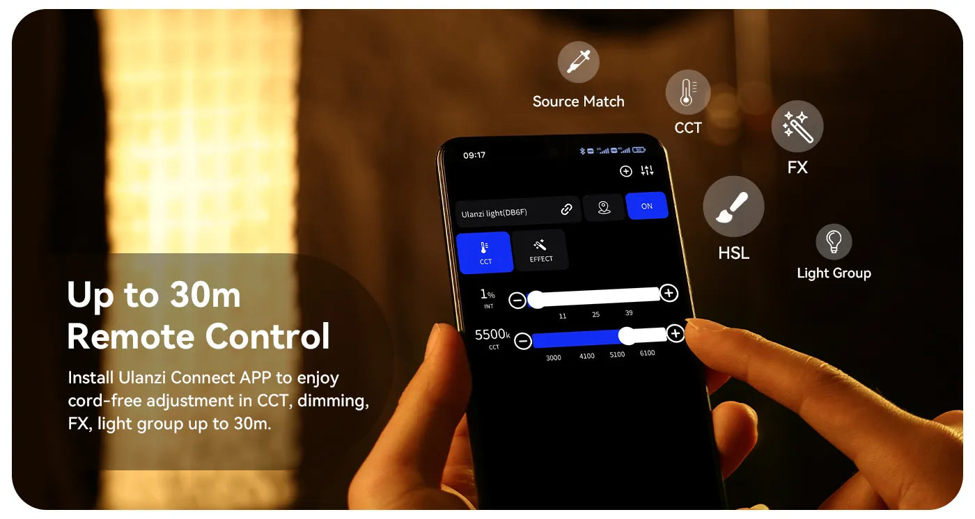 Az Ulanzi Connect alkalmazással akár 30 méter távolságból is vezérelheti a világítást, és testreszabhatja a CCT, a fényerő, az FX és a fénycsoportok beállításait. Az RGB verzióval 20, a kétszínű verzióval pedig 6 előre beállított fényhatás közül választhat. A felhasználóbarát funkciók között megtalálható az LCD kijelző, a fokozatmentes gomb, a 360°-ban forgatható L-állvány és a Bowens-kompatibilis rögzítés.
