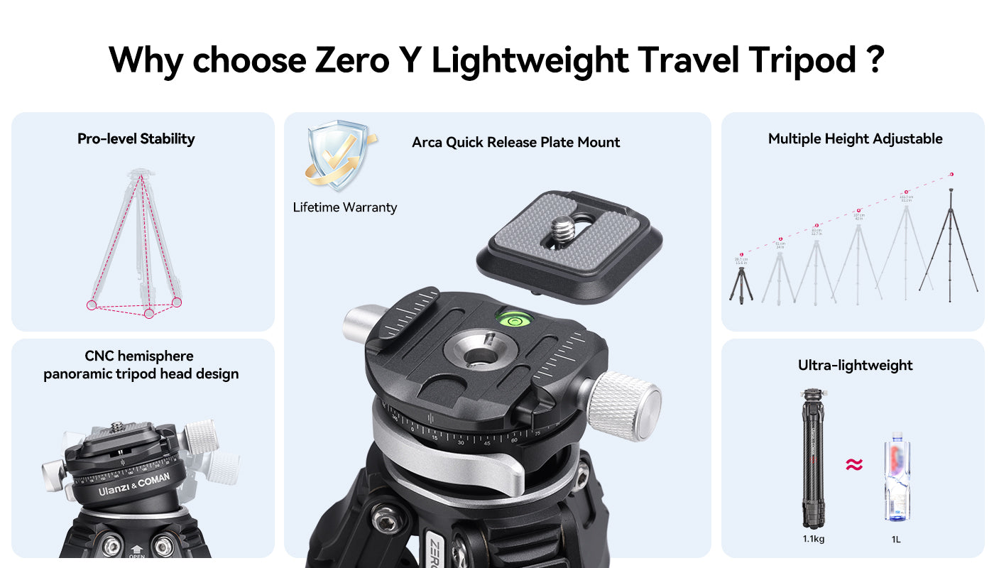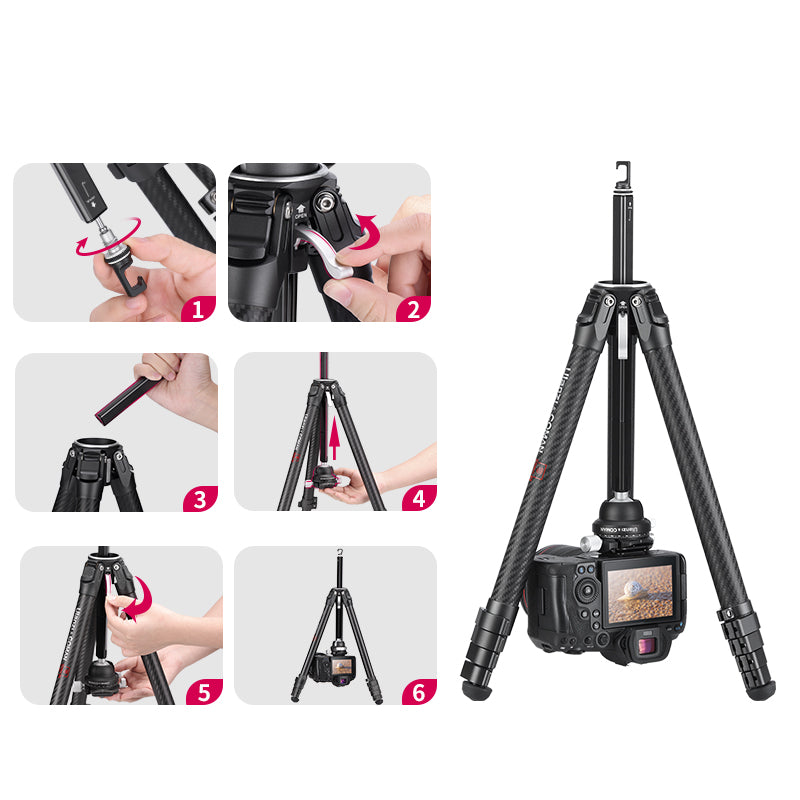 Ulanzi Zero-Y szénszálas könnyű utazási állvány 3028. Profi szintű stabilitás. Az egyedi kialakítás gyorsabb, könnyebb felállítást/lebontást tesz lehetővé. Rendkívül könnyű. Többféle magasságban állítható. CNC félgömb panorámás állványfej kialakítás.