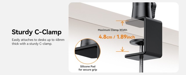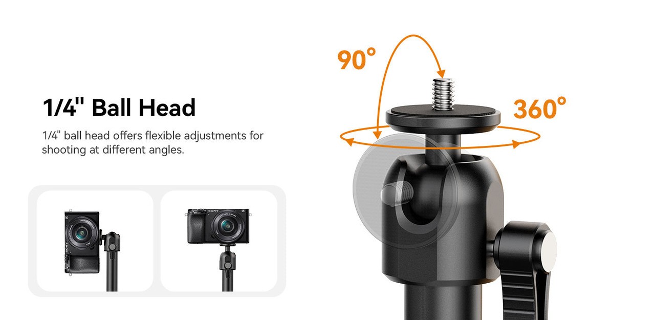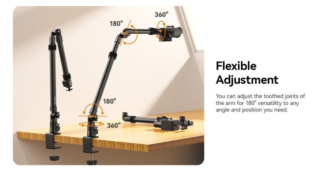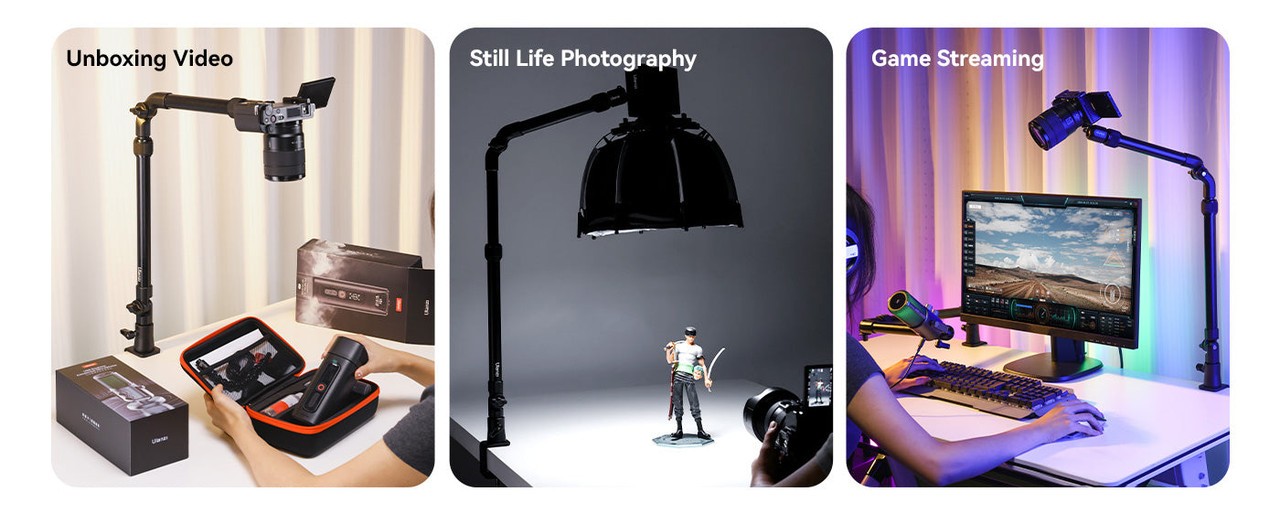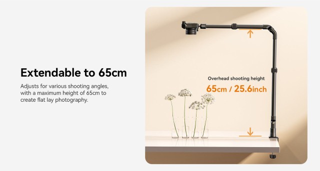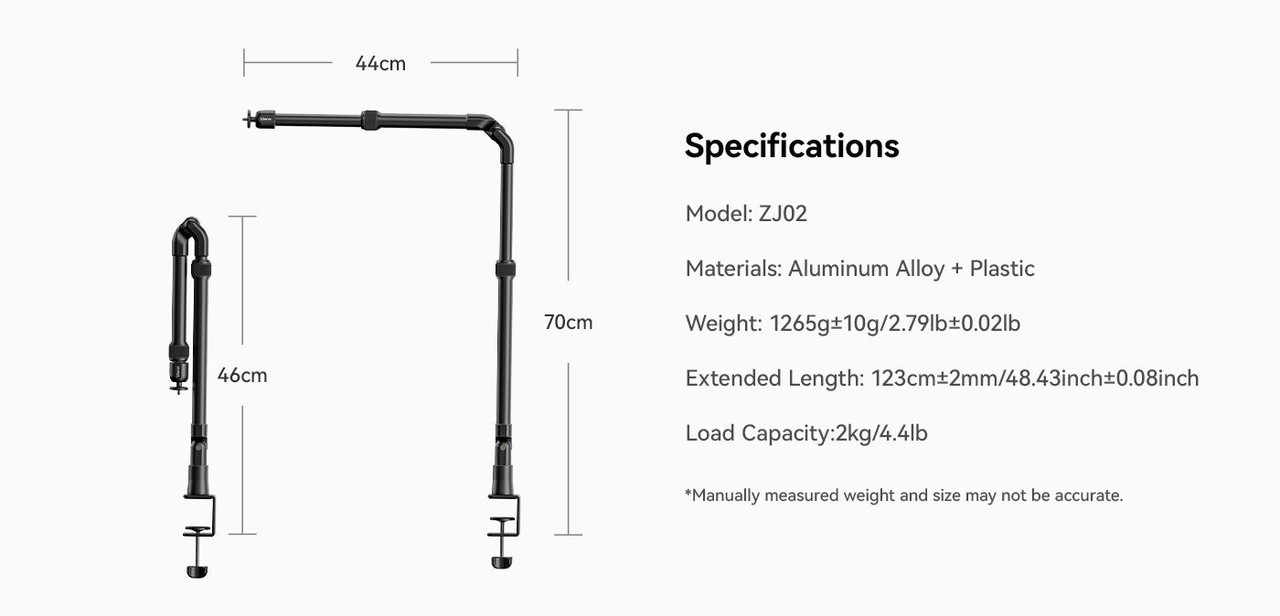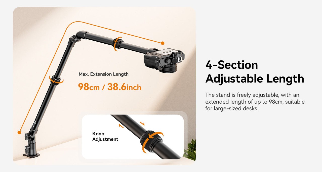 A tökéletes szöget az Ulanzi ZJ02 kameraasztali C-kapocsos állvány tartóval érheti el. A maximális rugalmasság érdekében tervezett állvány fogazott csatlakozásokkal rendelkezik, amelyek 180°-os beállítást tesznek lehetővé, így sokféle felvételi pozíciót biztosítanak. A felső kar 65 cm-ig nyújtható, ideális lapos felvételek készítéséhez, míg a teljes állvány 123 cm-ig nyújtható, így nagyobb asztalokra is felszerelhető. Tartós alumíniumötvözetből és műanyagból készült, és akár 2 kg súlyú eszközöket is biztonságosan megtart. A 1/4 hüvelykes gömbfej pontos szögbeállításokat tesz lehetővé, a szilárd C-kapocs pedig szilikon párnával biztosítja a stabil rögzítést akár 48 mm vastag asztalokon is. Könnyű, mégis robusztus, a ZJ02 tökéletes választás azoknak a tartalomalkotóknak, fotósoknak és videósoknak, akik stabilitást és sokoldalúságot keresnek egy állványban.
