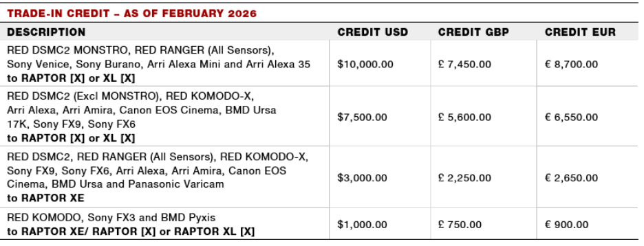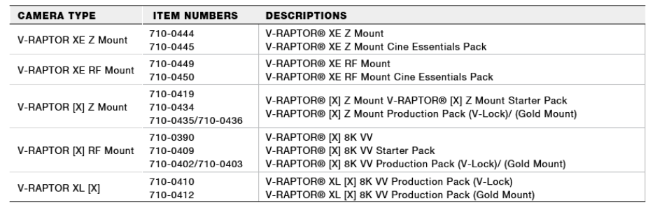 - Az ügyfél ára a meglévő kamera visszavásárlási kreditjének levonásával kerül meghatározásra a V-RAPTOR XE, V-RAPTOR [X] vagy V-RAPTOR XL [X] új kamera (önállóan vagy csomagban) ajánlott kiskereskedelmi árából (MSRP).