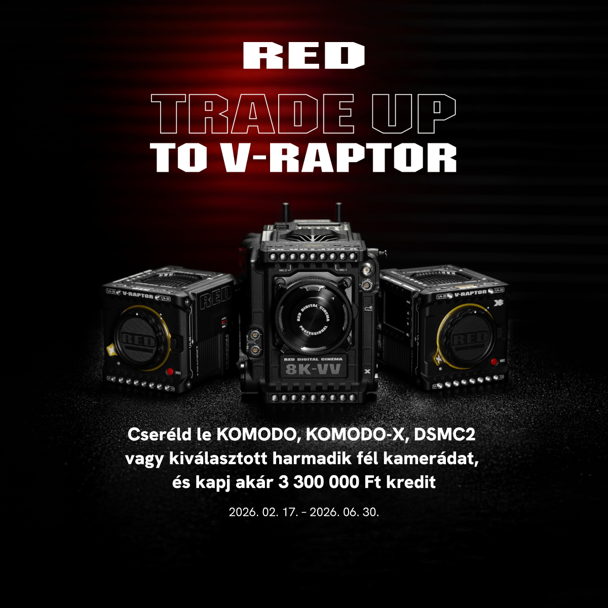 Cserélje be KOMODO, KOMODO-X, DSMC2 kameráját vagy kiválasztott harmadik féltől származó kameráját, és kapjon akár 3 300 000 Ft (8 700 €)! Így bővíthetiarzenálját a csúcskategóriás V-RAPTOR XL [X], V-RAPTOR [X] vagy V-RAPTOR XE modellekkel.