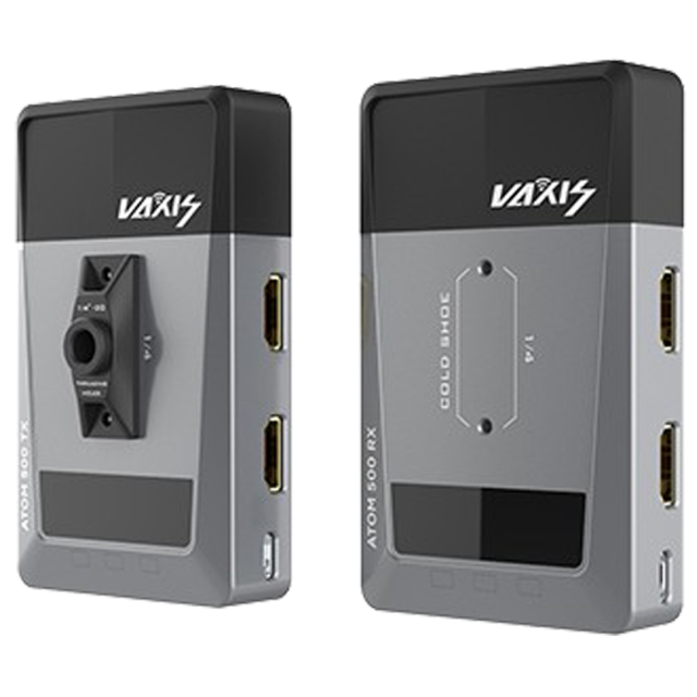 A Vaxis Atom 500 HDMI vezeték nélküli videó TX/RX készlete HDMI csatlakozással rendelkezik, és lehetővé teszi a vizuálisan veszteségmentes 1080p H.265 videojelek továbbítását az 5GHz-es sávban, 80 ms-nál kisebb késleltetéssel és akár 150 m-es látótávolsággal. A készülék emellett Wi-Fi-n keresztül akár három iOS-eszközre is multicastolhat a monitorozáshoz, és fényes OLED állapotjelzőt, USB-C csatlakozót kínál a tápellátáshoz (C típusú kábel tartozék) és a frissítésekhez, foglalatot egy L-sorozatú akkumulátor számára (az akkumulátor nem tartozék), valamint lehetőséget biztosít a hűtőventilátor kikapcsolására a gyártás során.