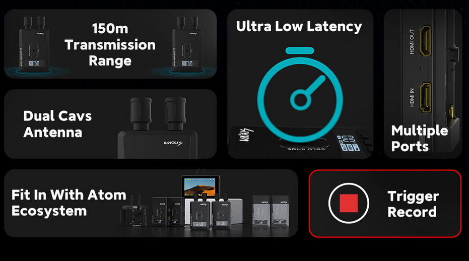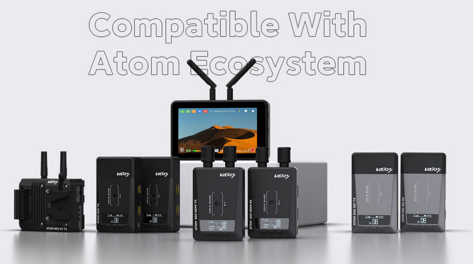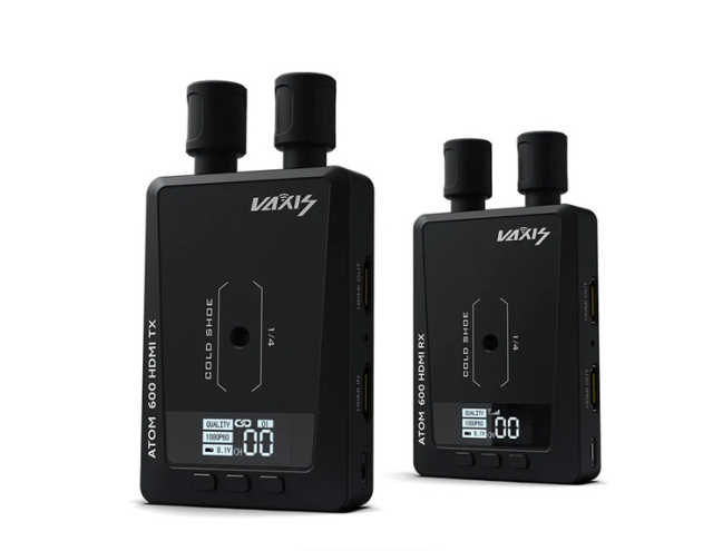 A Vaxis Atom 600 HDMI vezeték nélküli videó adó/vevő készlet vizuálisan veszteségmentes 1080p60 videót biztosít 80 ms alatti késleltetéssel 600 láb (kb. 183 m) látótávolságon belül, egyszerre akár öt eszköz (két vevő és három mobilalkalmazás) egyidejű átvitelét támogatja, kettős sávú 2,4/5,8 GHz-es antennákkal, állítható hűtőventilátorokkal, OLED kijelzőkkel, L-sorozatú akkumulátorokkal kompatibilis, valamint USB-C porttal rendelkezik a firmware frissítéshez és 5V/2A kimenethez.