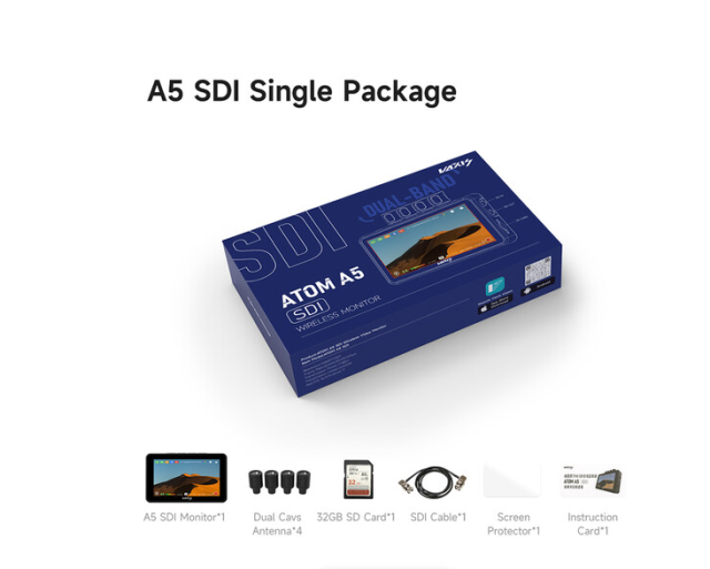 A Vaxis Atom A5 SDI egy kompakt, 5,5 hüvelykes, 1920x1080 felbontású érintőképernyős vezeték nélküli monitor beépített TX/RX funkcióval, amely az Atom ökoszisztémán belül akár 1000 láb (300 méter) átviteli távolságot támogat, SDI/HDMI bemenetekkel és hurok kimenetekkel, beépített MP4 felvételi funkcióval microSD-kártyára, kettős L-sorozatú akkumulátorlap, 2000 cd/m² fényerő, cserélhető antennák, időkód szinkronizálás, 3D LUT támogatás, valamint fejlett CINE OS eszközök, beleértve a pontos monitorozást és vezeték nélküli fókusz követést lehetővé tevő skópokat és csúcsjelzőket.