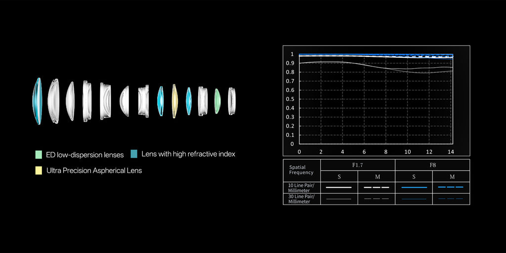 A 8 csoportban elrendezett 13 elem precízen megmunkált optikai kialakítása még F1,2 maximális rekeszértéknél is éles képet biztosít a kép szélétől a széléig, fenomenális részletgazdagságot és tisztaságot kínálva.