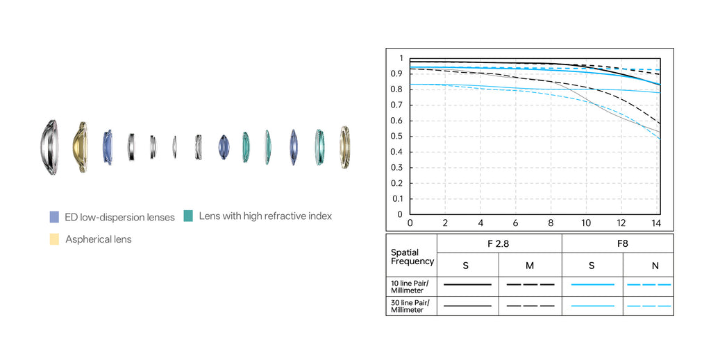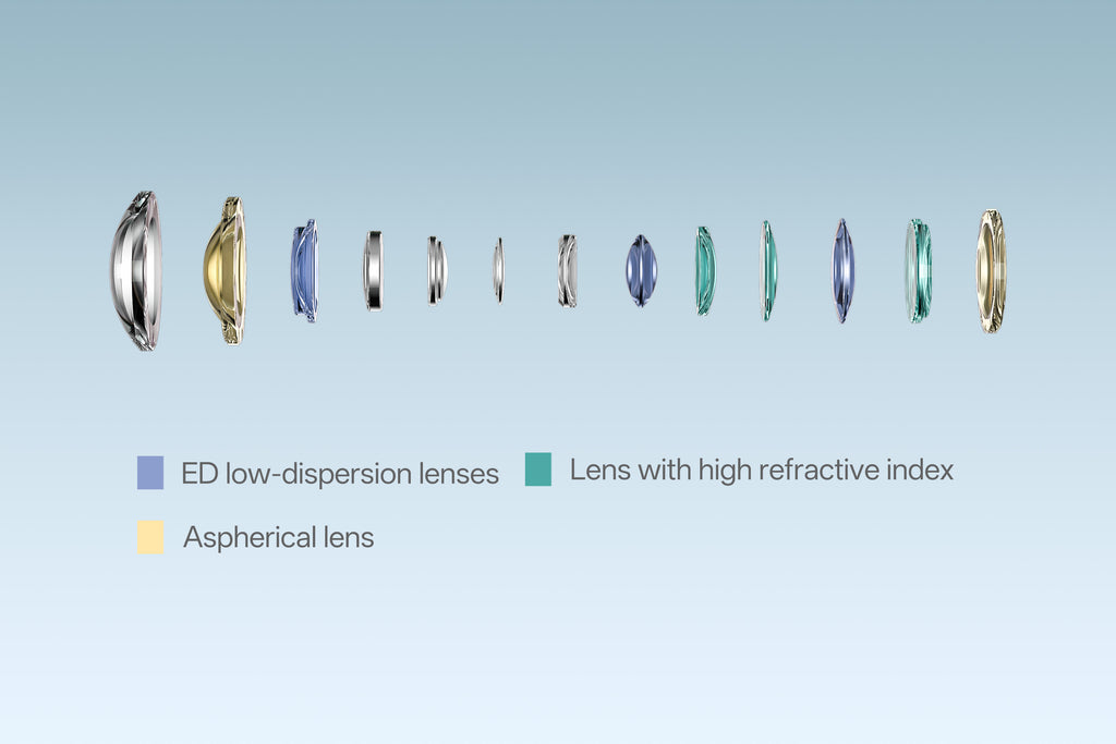 A gondosan kidolgozott, 11 csoportban elrendezett 13 optikai elem 2 aszférikus, 3 ED és 3 HR elemet tartalmaz a hatékony kromatikus aberráció és torzítás szabályozásához, miközben kivételes élességet biztosít az ultra-széles képeken.