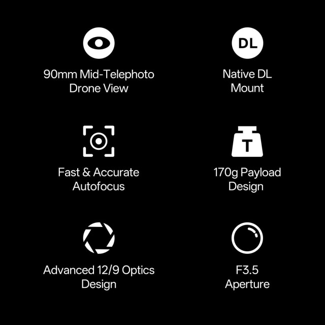 Natív DL foglalat A natív DL foglalattal épített AF 90mm F3.5 zökkenőmentesen kompatibilis az Inspire 3 X9-8K Air gimbal kamerájával, így egy új, erőteljes, közepes teleobjektív opciót kínál a légi filmezéshez.