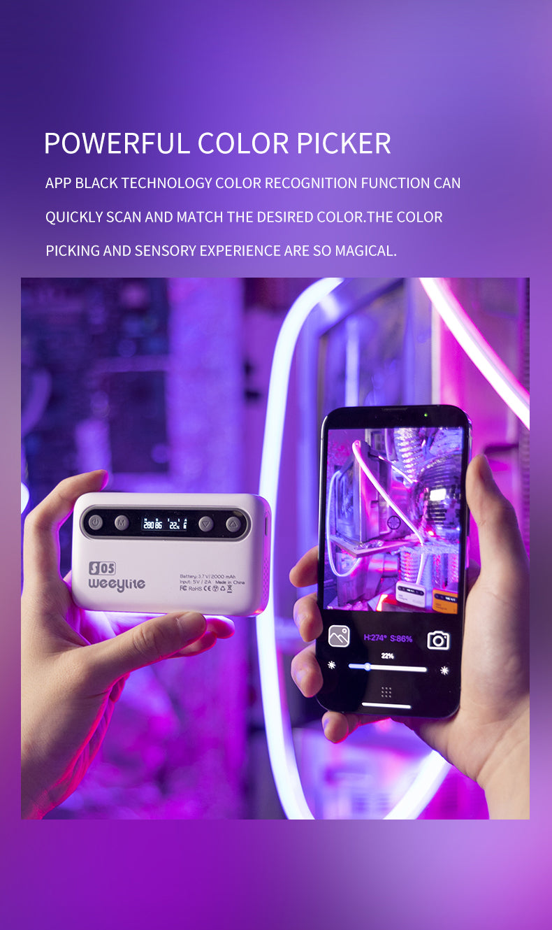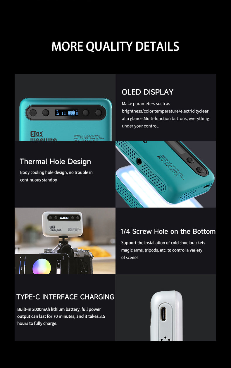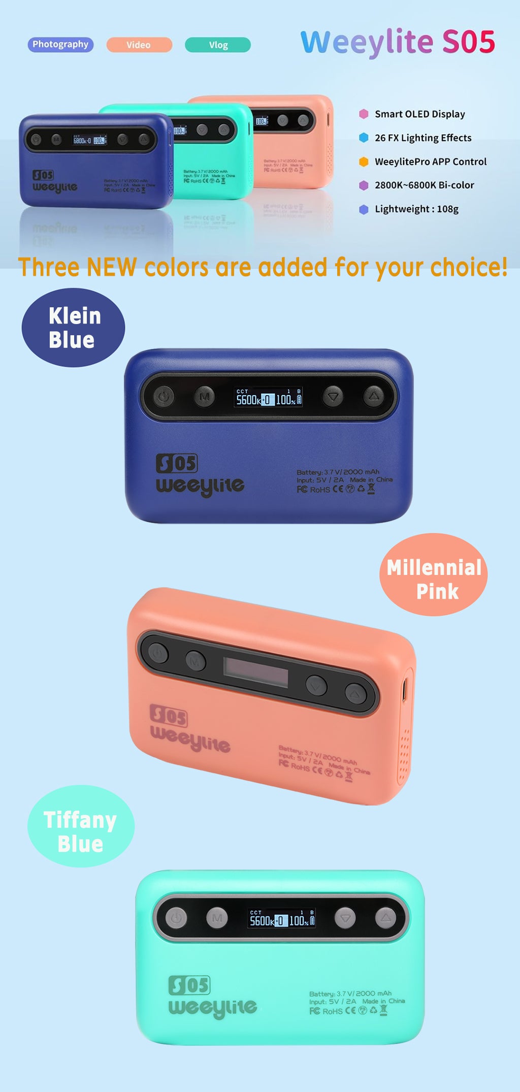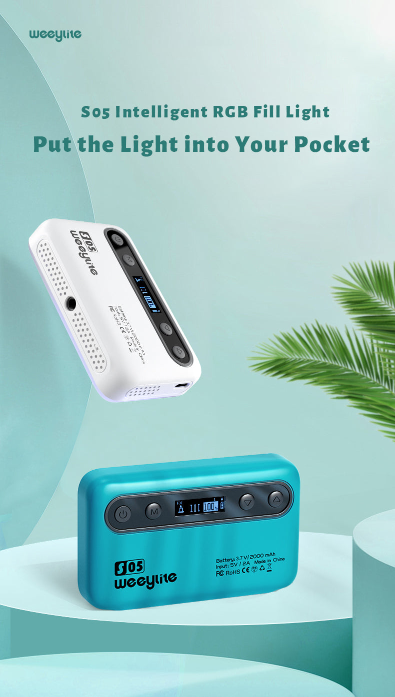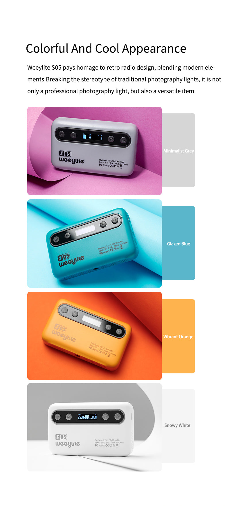 A Weeylite S05 töltőfény egy hordozható zsebkitöltő fény.Többféle magas színű (pozitív fehér + meleg fehér) és kiváló minőségű RGB fénygyöngyök vannak. Előnye az alacsony energiafogyasztás, a stabil színhőmérséklet, az energia- és energiatakarékosság, a hosszú élettartam, a kompakt méret és a kényelmes hordozás.Különböző jelenetekben fogadható el, és tökéletesen használható fotózásban, videóban, vlog felvételben, élő adásban és így tovább.
