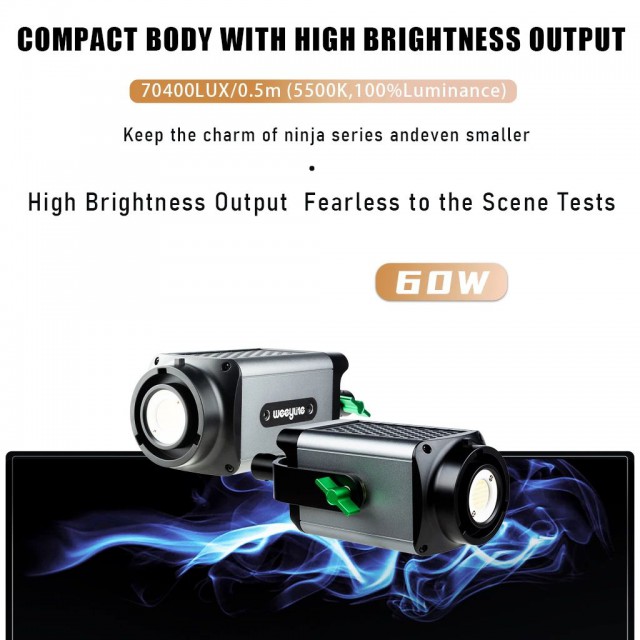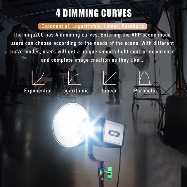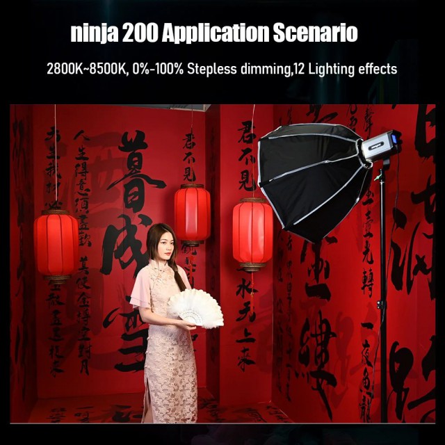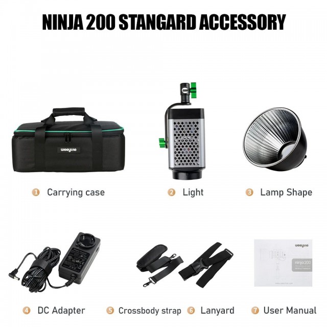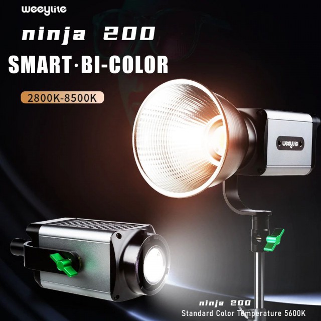 A Weeylite Ninja 200 60W Bi-color LED stúdió reflektor fejlett COB LED technológiát használ a nagy fénykibocsátás és a jó színvisszaadás (≥95 RA) érdekében. Ideális stúdiófotózáshoz, videózáshoz stb. Teljesen állítható színhőmérsékletet kínál 2800K-8500K között és intenzitást 0-100% között (max. 5800 lm, 70400 lx/0,5m). A távvezérlés ezzel a modellel Bluetooth-on és mobilalkalmazáson keresztül lehetséges, az áramellátás NP-960/970 akkumulátorral (nem tartozék) vagy külső tápegységgel (tápegység tartozék) történik. Méretek 175x92x85 mm, súly 990 g. A népszerű Ninja 400 kevésbé erős, de hordozhatóbb változata.