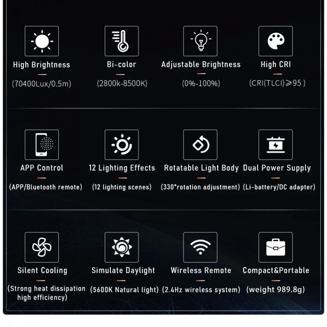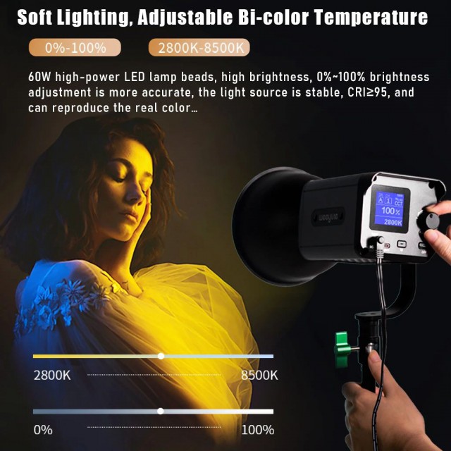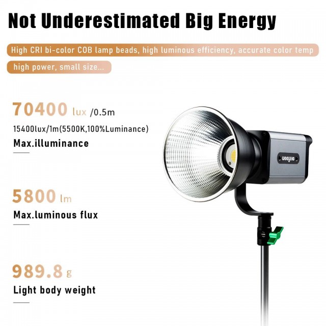 A Weeylite Ninja 200 60W Bi-color LED stúdió reflektor fejlett COB LED technológiát használ a nagy fénykibocsátás és a jó színvisszaadás (≥95 RA) érdekében. Ideális stúdiófotózáshoz, videózáshoz stb. Teljesen állítható színhőmérsékletet kínál 2800K-8500K között és intenzitást 0-100% között (max. 5800 lm, 70400 lx/0,5m). A távvezérlés ezzel a modellel Bluetooth-on…