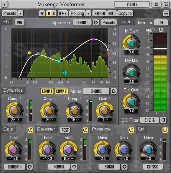 A Voxformer egy sokoldalú audioeffekt AAX, AU és VST interfészekhez, amely megkönnyíti a vokálfeldolgozást. Egyesíti a professzionális, sokoldalú eszközöket a vokális felvételek teljes körű szerkesztéséhez, legyen szó énekről vagy beszélt szövegről