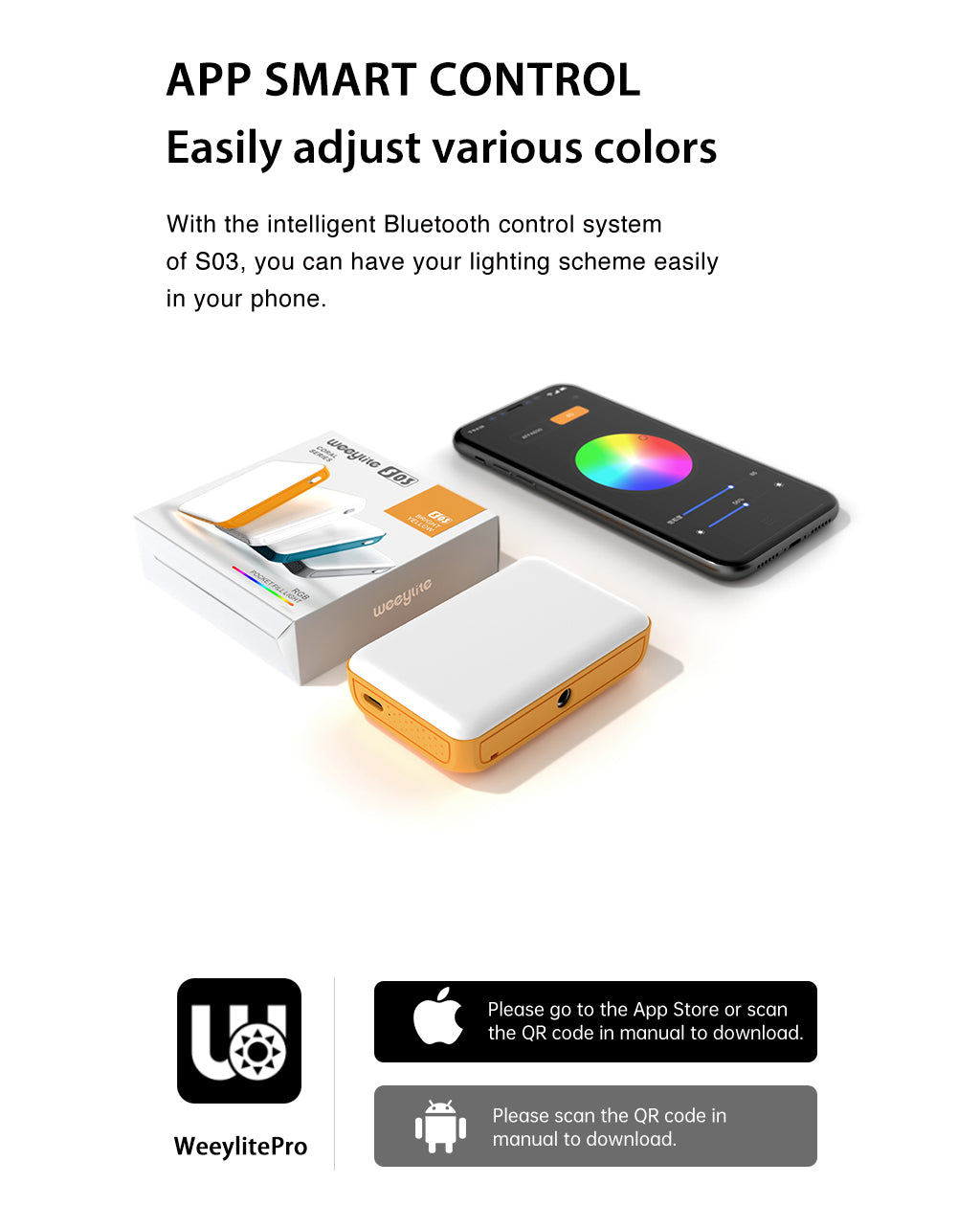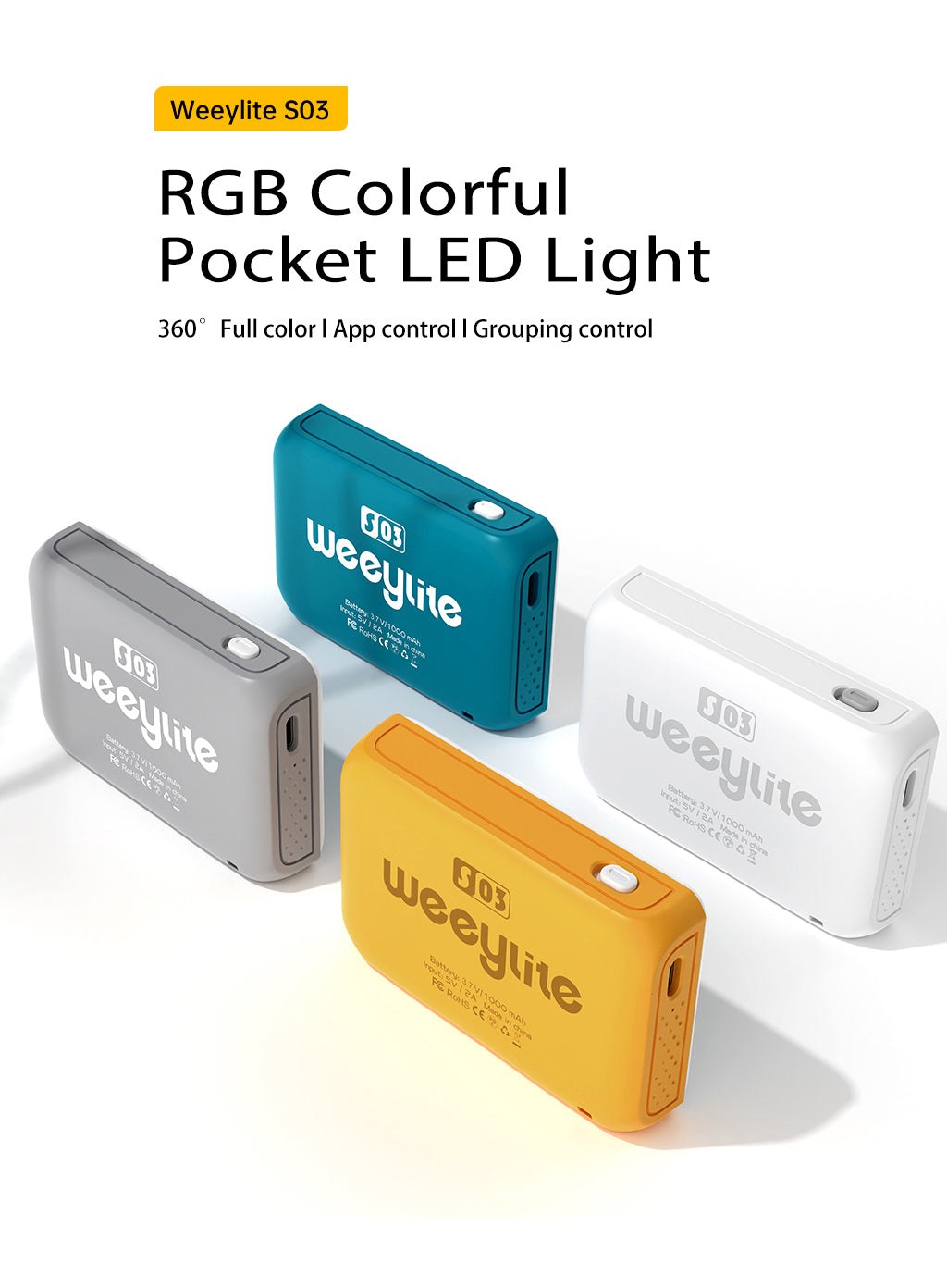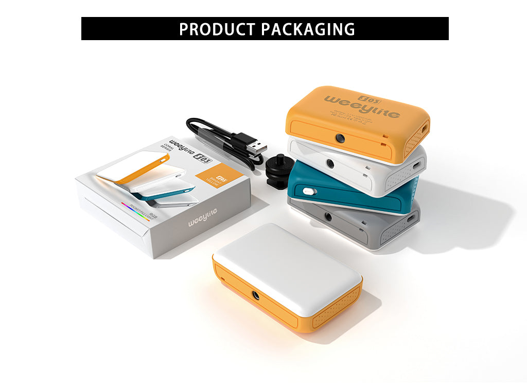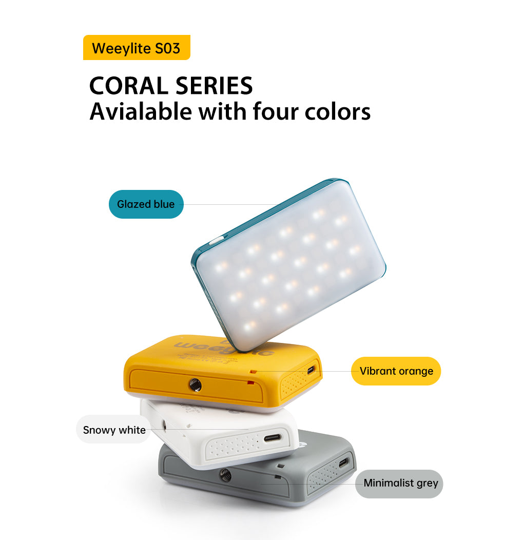 A Weeylite S03 egy hordozható lámpa. Többféle színű (Hideg fehér + meleg fehér) és kiváló minőségű RGB színekkel rendelkezik. Előnye az alacsony energiafogyasztás, a stabil színhőmérséklet, a hosszú élettartam, valamint a kompakt méret. Különböző jelenetekben fogadható el, és tökéletesen használható fényképezéshez, video- és vlog-felvételhez, élő közvetítéshez és így tovább.
