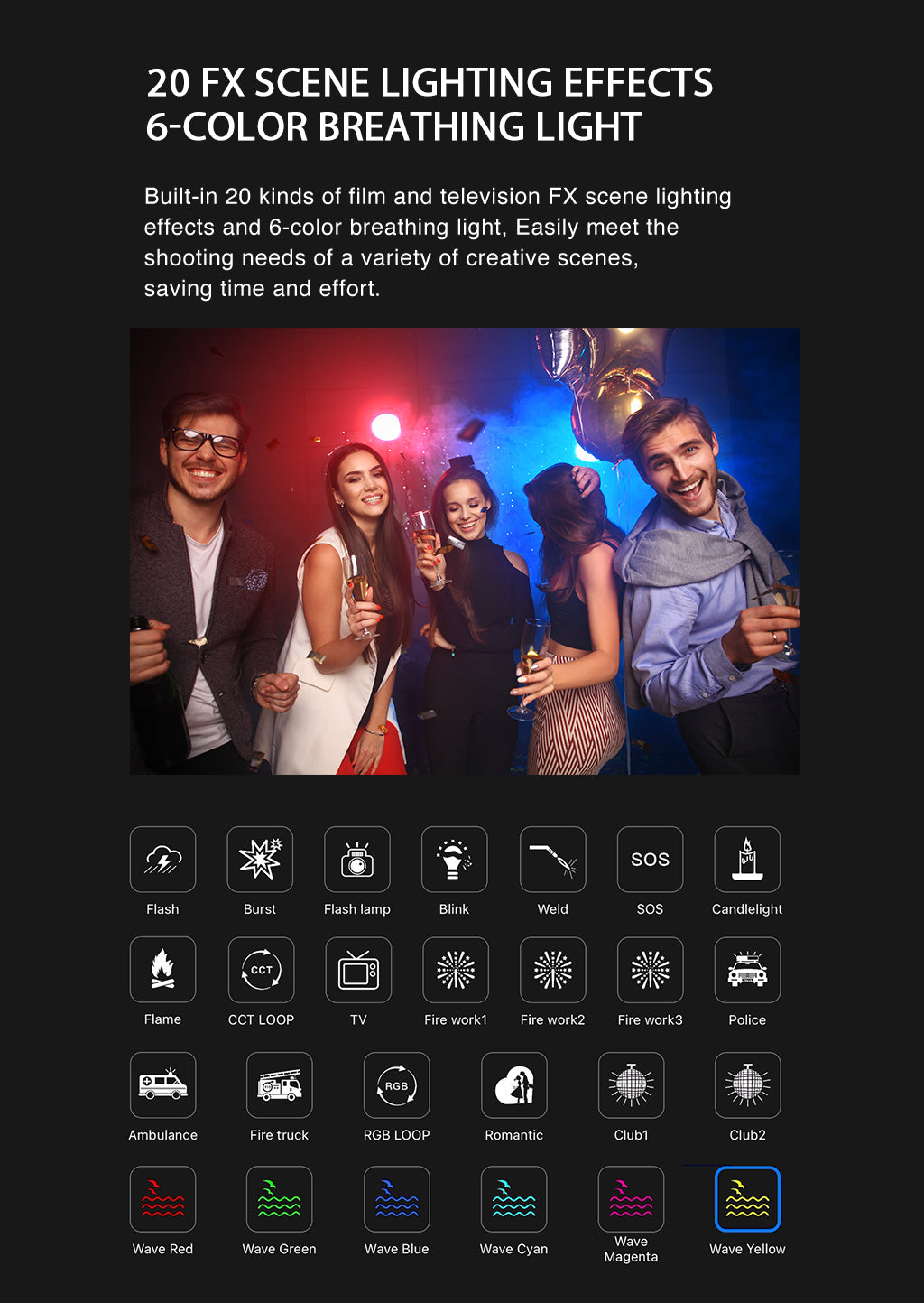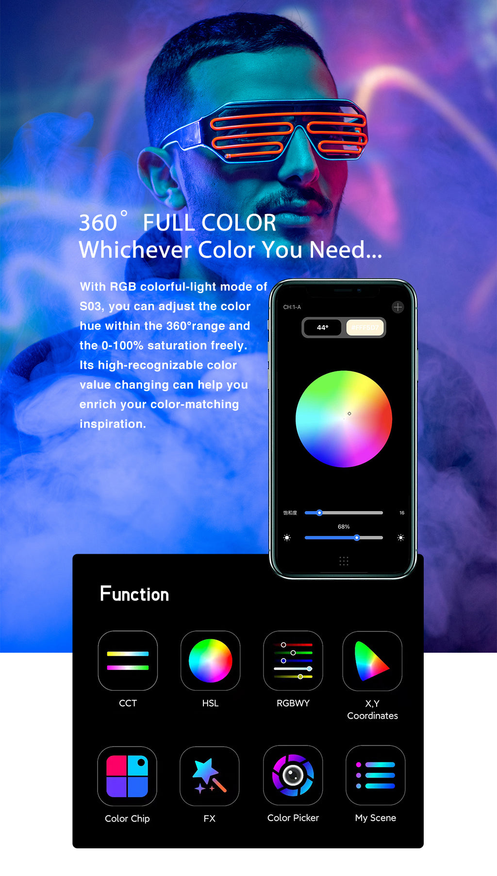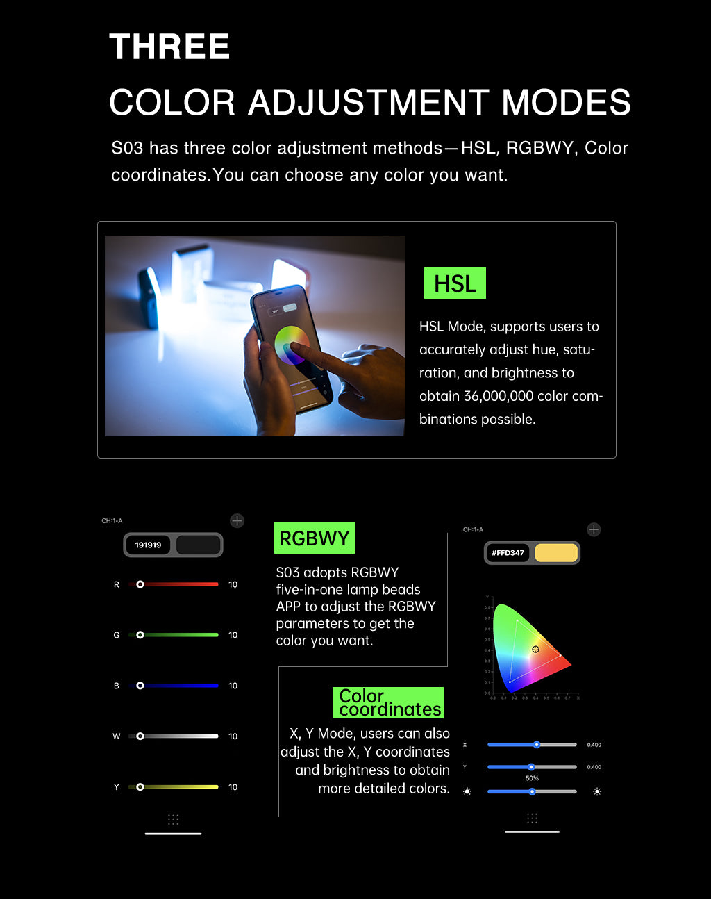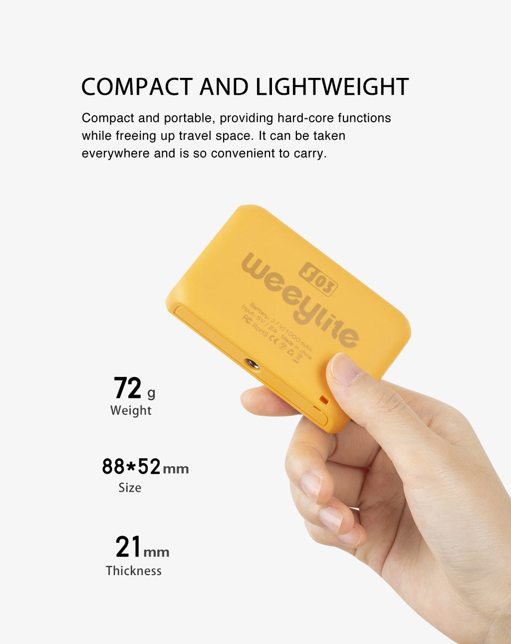A Weeylite S03 egy hordozható lámpa. Többféle színű (Hideg fehér + meleg fehér) és kiváló minőségű RGB színekkel rendelkezik. Előnye az alacsony energiafogyasztás, a stabil színhőmérséklet, a hosszú élettartam, valamint a kompakt méret. Különböző jelenetekben fogadható el, és tökéletesen használható fényképezéshez, video- és vlog-felvételhez, élő közvetítéshez és így tovább.