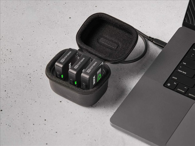 Az integrált akkumulátornak köszönhetően a vezeték nélküli készlet egyidejűleg is képes tölteni. Akár két teljes feltöltést is lehetővé tesz a háromelemes készlet számára, így a Wireless Go háromelemes készlet akár 21 órán át is működhet. A USB-C csatlakozás segítségével hozzáférhet az egész rendszer adataihoz a felvételek átviteléhez, a beállítások módosításához és a vezeték nélküli készlet firmware-jének frissítéséhez.