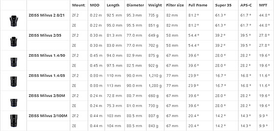 A távfókusz rögzítésére szolgáló ZEISS Lens Gear kerék szerszámmentes, és négy különböző méretben kapható: mini (62-69 mm, 60-67 mm GumGum gumipárnával), kicsi (71-77 mm, 69-75 mm GumGum gumipárnával), közepes (78-84 mm, 76-82 mm GumGum gumipárnával) és nagy (86-93 mm, 84-91 mm GumGum gumipárnával). Tartalmaz egy "GumGum" gumipárnát is, amely ragasztófelülettel rendelkezik, hogy csökkentse a belső átmérőt és/vagy megvédje az objektív fókuszgyűrűjét. A Zeiss Otus, Milvus és Loxia objektívek kompatibilitási táblázatát itt találja.