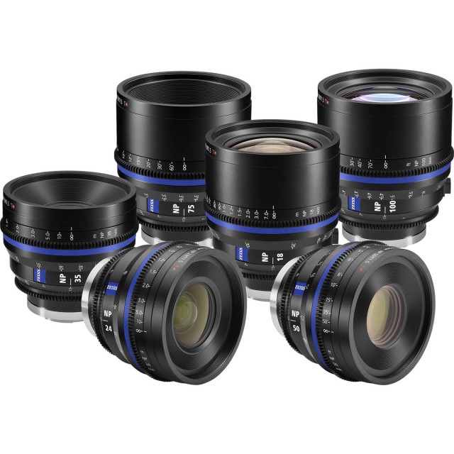 Zeiss Nano Prime 18 mm, 24 mm, 35 mm, 50 mm, 75 mm és 100 mm T/1,5 objektívekből álló készlet egy erős hordtáskában. Cserélhető bajonett a Sony E számára, metrikus skála.