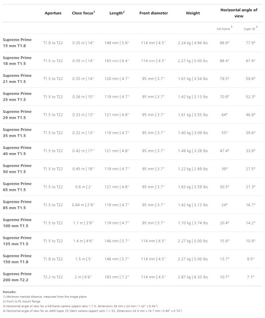 A ZEISS Supreme Prime csúcskategóriás filmobjektívek sorozata maximális konzisztenciát kínál minden modellben: egységes szenzorlefedettség, szín, fényerő (T1,5 a legtöbb modellnél), méret, súly és a kezelőszervek elhelyezése. A sorozat minden objektívje megbízhatóan lefedi az FF-érzékelőket (46,2 mm-es körkörös vetület), támogatja az eXtended Data technológiát, és - a "cserélhető rögzítési rendszernek" köszönhetően - kompatibilis a PL, LPL és EF bajonettekkel (az objektívek alapfelszereltségként PL-bajonettel és metrikus jelöléssel rendelkeznek).