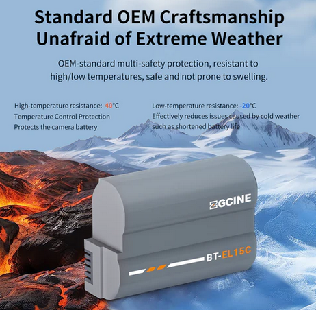 A ZGCINE BT-EL15C egy professzionális minőségű, 2400 mAh-s lítium-ion akkumulátor, amelyet a Nikon EN-EL15c akkumulátorának zökkenőmentes cseréjére terveztek (és visszafelé kompatibilis az EN-EL15b/a akkumulátorokkal). Teljesen dekódolt, teljes mértékben kommunikál a fényképezőgép testével, pontosan jeleníti meg az akkumulátor százalékos töltöttségét, és hibamentesen támogatja a fényképezőgépben történő töltést. Prémium lítium-ion cellákkal és 8 rétegű védelmi rendszerrel (túlterhelés, túláram, rövidzárlat, túlmelegedés stb.) rendelkezik, ami stabil és biztonságos működést garantál. A ZGCINE PS sorozatú töltőtokokkal vagy PC sorozatú töltőkkel párosítva támogatja a nagy sebességű töltést, és mindössze 2 óra alatt eléri a 100%-os töltöttségi szintet.