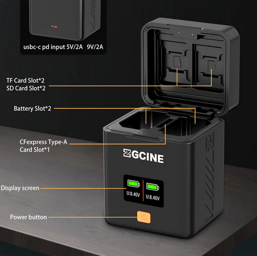 A ZGCINE töltőtáska a Fujifilm NP-W235 akkumulátorhoz egy kompakt, hatékony megoldás az NP-W235 akkumulátorok töltésére, USB-C PD gyorstöltéssel, több kártyahelyekkel és egy világos OLED kijelzővel a könnyű felügyelet érdekében.