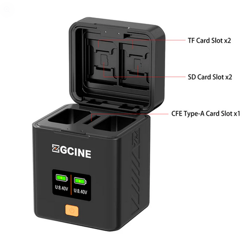 A ZGCINE töltőtáska a SONY NP-FW50 akkumulátorhoz egy kompakt és hatékony töltési megoldás USB-C PD bemenettel, több memóriakártya-foglalattal és 0,96 hüvelykes OLED-képernyővel a valós idejű állapotfigyeléshez.