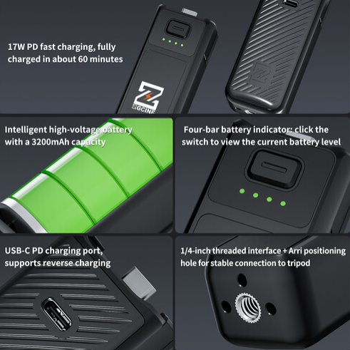 A ZGCINE PK-H01 akkumulátor markolat egy nagy teljesítményű kiegészítő a DJI Osmo Pocket 3 kamerákhoz, amely intelligens, 3200 mAh kapacitású nagyfeszültségű akkumulátort kínál a gondtalan felvételekhez. Kompakt és könnyű kialakítása könnyű hordozhatóságot biztosít, míg a 17 W-os PD gyorstöltés lehetővé teszi az akkumulátor markolat teljes feltöltését körülbelül 60 perc alatt. A markolat támogatja az alacsony hőmérsékletű töltést minimális elektromos zajjal, a USB-C PD-n keresztüli fordított töltést, és négycsíkos akkumulátor-jelzővel rendelkezik a valós idejű figyelemmel kíséréshez. 1/4 hüvelykes menetes interfésszel és Arri pozicionáló lyukkal biztosítja a stabil csatlakozást a állványokhoz. Ezenkívül lehetővé teszi a közvetlen adatátvitelt a számítógépekhez, hogy kényelmesen hozzáférhessen a memóriakártya fájljaihoz.