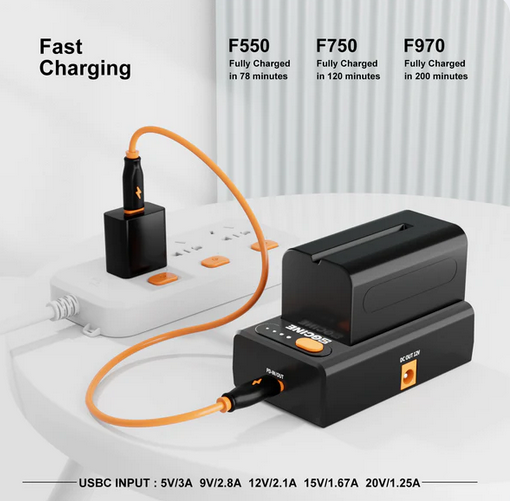 Az F550 esetében mindössze 78 perces, az F750 esetében 120 perces, az F970 esetében pedig 200 perces gyors töltési idővel ez a töltő biztosítja, hogy mindig készen álljon a következő felvételre. Akár a felszerelésének áramellátására, akár az akkumulátorok gyors feltöltésére van szüksége, ez a többcélú töltő a megoldás, amire szüksége van.