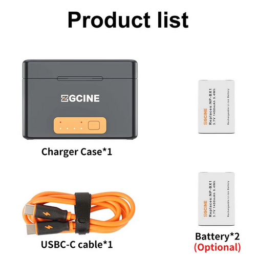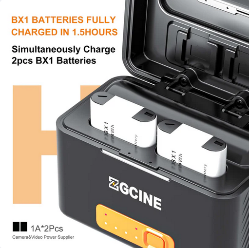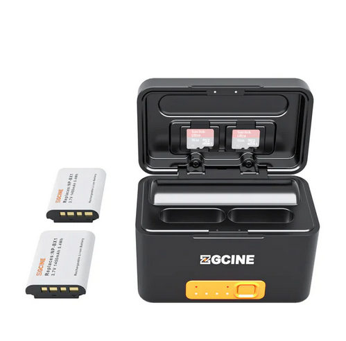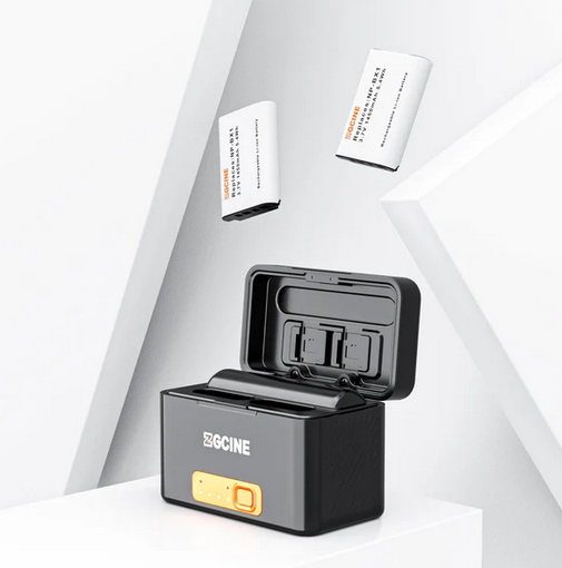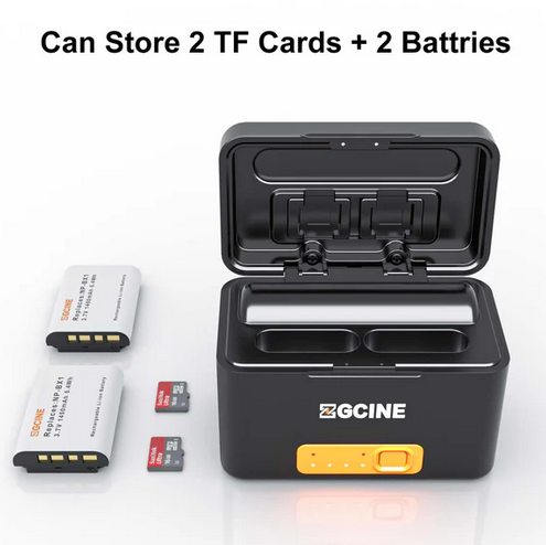 A ZGCINE SONY BX1 akkumulátor töltő tok (PS-BX1 Kit2) két NP-BX1 akkumulátort tartalmaz, így hordozható megoldást kínál a Sony készülékek gyors töltésére és hatékony tárolására.