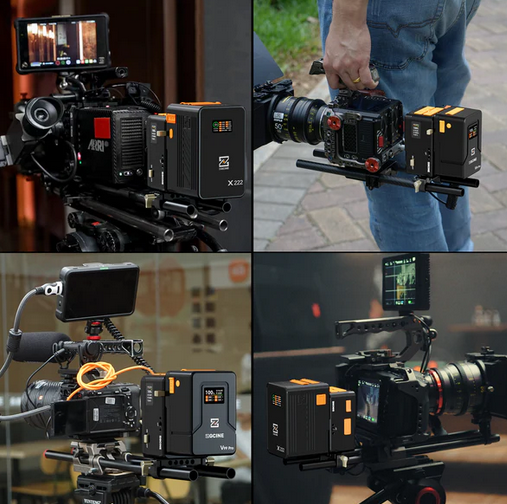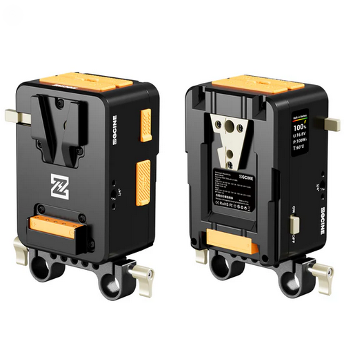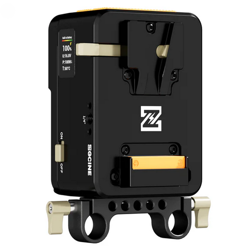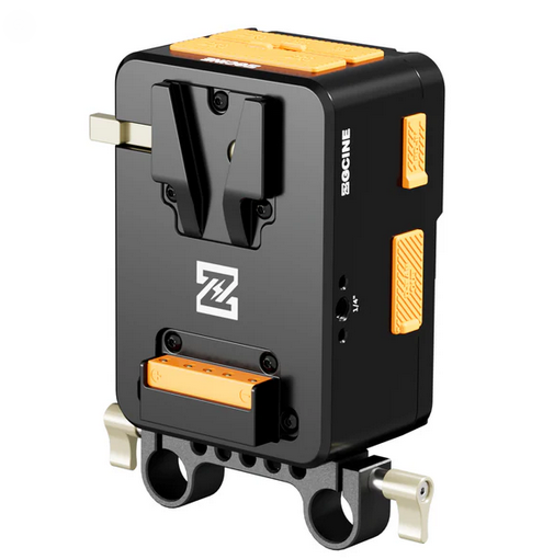 A narancssárga ZGCINE VM-HS1 HotSwap Plate egy belső akkumulátoros V-mount lemez, amely hot-swap funkcióval rendelkezik a professzionális kamerák folyamatos áramellátásához. Beépített 50 Wh-s akkumulátorral rendelkezik a zökkenőmentes átálláshoz, több kimeneti porttal, köztük kettős USB-C PD és négy D-Tap porttal, valamint 0,96 hüvelykes IPS kijelzővel és visszaszámláló emlékeztetővel.